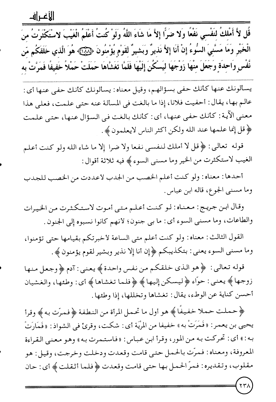 {قل لَا أملك لنَفْسي نفعا وَلَا ضرا إِلَّا مَا شَاءَ الله وَلَو كنت أعلم الْغَيْب لاستكثرت من الْخَيْر وَمَا مسني السوء إِن أَنا إِلَّا نَذِير وَبشير لقوم يُؤمنُونَ (188) هُوَ الَّذِي خَلقكُم من نفس وَاحِدَة وَجعل مِنْهَا زَوجهَا ليسكن إِلَيْهَا فَلَمَّا تغشاها حملت حملا خَفِيفا فمرت بِهِ} يَسْأَلُونَك عَنْهَا كَأَنَّك حفي بسؤالهم، وَقيل مَعْنَاهُ: يَسْأَلُونَك كَأَنَّك حفي عَنْهَا أَي: عَالم بهَا، يُقَال: أحفيت فلَانا، إِذا مَا بالغت فِي الْمَسْأَلَة عَنهُ حَتَّى علمت، فعلى هَذَا معنى الْآيَة: كَأَنَّك حفي عَنْهَا، أَي: كَأَنَّك بالغت فِي السُّؤَال عَنْهَا، حَتَّى علمت {قل إِنَّمَا علمهَا عِنْد الله وَلَكِن أَكثر النَّاس لَا يعلمُونَ} .