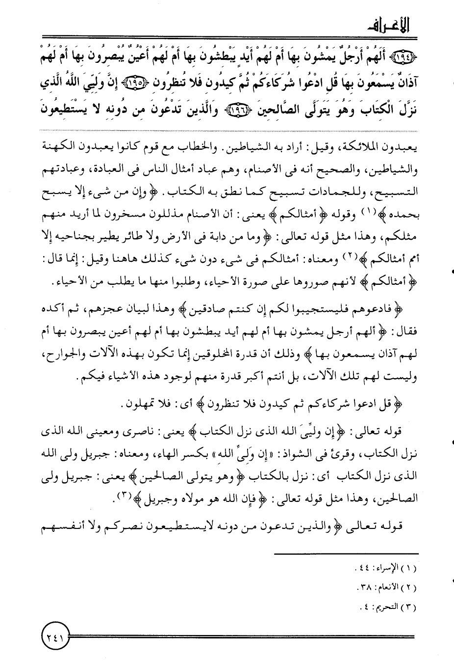 ( {194) ألهم أرجل يَمْشُونَ بهَا أم لَهُم أيد يبطشون بهَا أم لَهُم أعين يبصرون بهَا أم لَهُم آذان يسمعُونَ بهَا قل ادعوا شركاءكم ثمَّ كيدون فَلَا تنْظرُون (195) إِن وليي الله الَّذِي نزل الْكتاب وَهُوَ يتَوَلَّى الصَّالِحين (196) وَالَّذين تدعون من دونه لَا يَسْتَطِيعُونَ} يعْبدُونَ الْمَلَائِكَة، وَقيل: أَرَادَ بِهِ الشَّيَاطِين. وَالْخطاب مَعَ قوم كَانُوا يعْبدُونَ الكهنة وَالشَّيَاطِين، وَالصَّحِيح أَنه فِي الْأَصْنَام، وهم عباد أَمْثَال النَّاس فِي الْعِبَادَة، وعبادتهم التَّسْبِيح، وللجمادات تَسْبِيح كَمَا نطق بِهِ الْكتاب. {وَإِن من شَيْء إِلَّا يسبح بِحَمْدِهِ} وَقَوله {أمثالكم} يَعْنِي: أَن الْأَصْنَام مذللون مسخرون لما أُرِيد مِنْهُم مثلكُمْ، وَهَذَا مثل قَوْله تَعَالَى: {وَمَا من دَابَّة فِي الأَرْض وَلَا طَائِر يطير بجناحيه إِلَّا أُمَم أمثالكم} وَمَعْنَاهُ: أمثالكم فِي شَيْء دون شَيْء كَذَلِك هَاهُنَا وَقيل: إِنَّمَا قَالَ: {أمثالكم} لأَنهم صوروها على صُورَة الْأَحْيَاء، وطلبوا مِنْهَا مَا يطْلب من الْأَحْيَاء.
