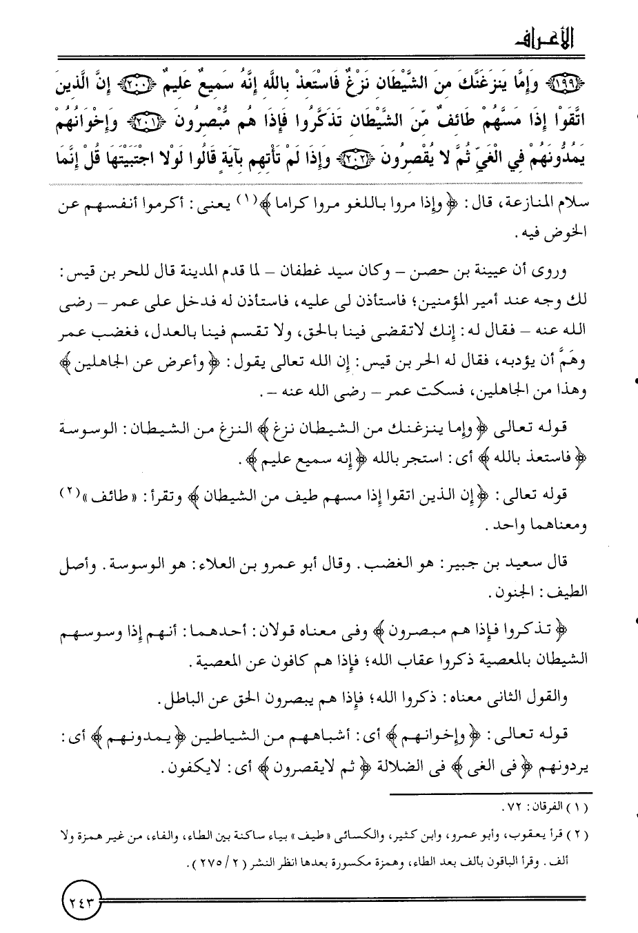 ( {199) وَإِمَّا يَنْزغَنك من الشَّيْطَان نَزغ فاستعذ بِاللَّه إِنَّه سميع عليم (200) إِن الَّذين اتَّقوا إِذا مسهم طائف من الشَّيْطَان تَذكرُوا فَإِذا هم مبصرون (201) وإخوانهم يمدونهم فِي الغي ثمَّ لَا يقصرون (202) وَإِذا لم تأتهم بِآيَة قَالُوا لَوْلَا اجتبيتها قل إِنَّمَا} سَلام الْمُنَازعَة، قَالَ: {وَإِذا مروا بِاللَّغْوِ مروا كراما} يَعْنِي: أكْرمُوا أنفسهم عَن الْخَوْض فِيهِ.