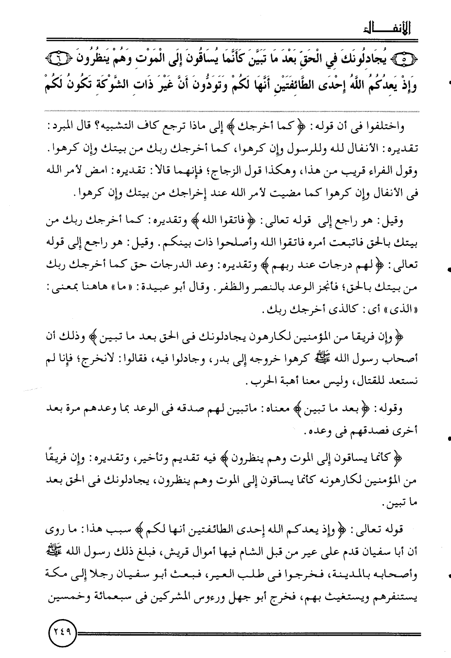 {وَإِن فريقا من الْمُؤمنِينَ لكارهون يجادلونك فِي الْحق بعد مَا تبين} وَذَلِكَ أَن أَصْحَاب رَسُول الله كَرهُوا خُرُوجه إِلَى بدر، وجادلوا فِيهِ، فَقَالُوا: لَا نخرج؛ فَإنَّا لم نستعد لِلْقِتَالِ، وَلَيْسَ مَعنا أهبة الْحَرْب.
