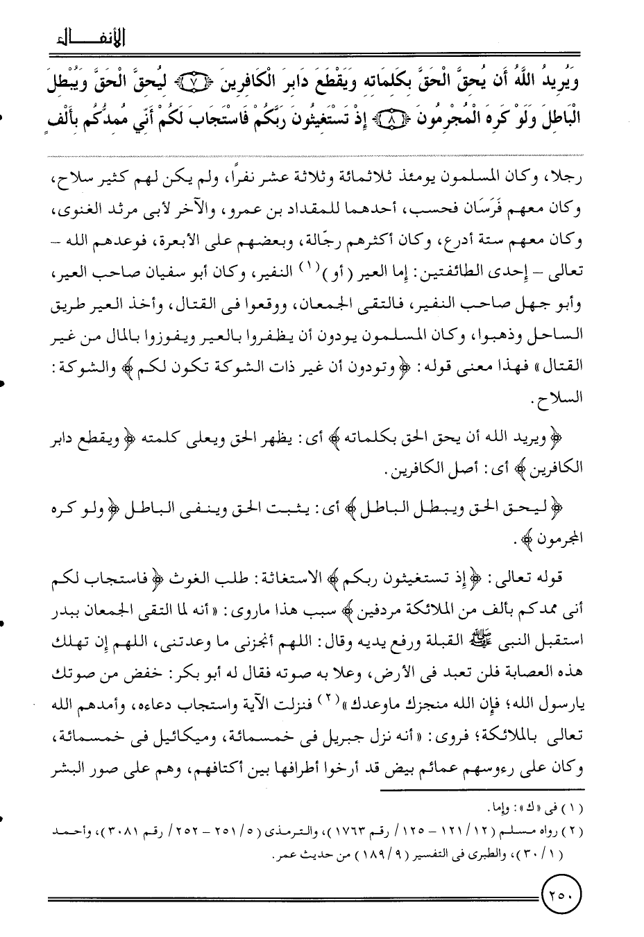 {وَيُرِيد الله أَن يحِق الْحق بكلماته وَيقطع دابر الْكَافرين (7) ليحق الْحق وَيبْطل الْبَاطِل وَلَو كره المجرمون (8) إِذْ تَسْتَغِيثُونَ ربكُم فَاسْتَجَاب لكم أَنِّي مُمِدكُمْ بِأَلف} رجلا، وَكَانَ الْمُسلمُونَ يَوْمئِذٍ ثَلَاثمِائَة وَثَلَاثَة عشر نَفرا، وَلم يكن لَهُم كثير سلَاح، وَكَانَ مَعَهم فرسَان فَحسب، أَحدهمَا لِلْمِقْدَادِ بن عَمْرو، وَالْآخر لأبي مرْثَد الغنوي، وَكَانَ مَعَهم سِتَّة أدرع، وَكَانَ أَكْثَرهم رِجَاله، وَبَعْضهمْ على الأبعرة، فَوَعَدَهُمْ الله - تَعَالَى - إِحْدَى الطَّائِفَتَيْنِ: إِمَّا العير (أَو) النفير، وَكَانَ أَبُو سُفْيَان صَاحب العير، وَأَبُو جهل صَاحب النفير، فَالتقى الْجَمْعَانِ، ووقعوا فِي الْقِتَال، وَأخذ العير طَرِيق السَّاحِل وذهبوا، وَكَانَ الْمُسلمُونَ يودون أَن يظفروا بالعير ويفوزوا بِالْمَالِ من غير الْقِتَال " فَهَذَا معنى قَوْله: {وتودون أَن غير ذَات الشَّوْكَة تكون لكم} والشوكة: السِّلَاح.