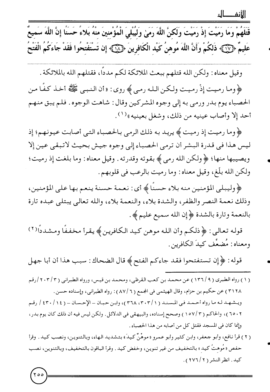 {قَتلهمْ وَمَا رميت إِذْ رميت وَلَكِن الله رمى وليبلي الْمُؤمنِينَ مِنْهُ بلَاء حسنا إِن الله سميع عليم (17) ذَلِكُم وَأَن الله موهن كيد الْكَافرين (18) إِن تستفتحوا فقد جَاءَكُم الْفَتْح}
