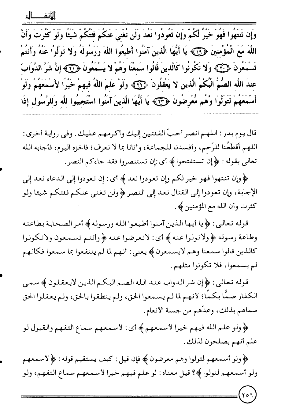 {وَإِن تنتهوا فَهُوَ خير لكم وَإِن تعودوا نعد وَلنْ تغني عَنْكُم فِئَتكُمْ شَيْئا وَلَو كثرت وَأَن الله مَعَ الْمُؤمنِينَ (19) يَا أَيهَا الَّذين آمنُوا أطِيعُوا الله وَرَسُوله وَلَا توَلّوا عَنهُ وَأَنْتُم تَسْمَعُونَ (20) وَلَا تَكُونُوا كَالَّذِين قَالُوا سمعنَا وهم لَا يسمعُونَ (21) إِن شَرّ الدَّوَابّ عِنْد الله الصم الْبكم الَّذين لَا يعْقلُونَ (22) وَلَو علم الله فيهم خيرا لأسمعهم وَلَو أسمعهم لتولوا وهم معرضون (23) يَا أَيهَا الَّذين آمنُوا اسْتجِيبُوا لله وَلِلرَّسُولِ إِذا} قَالَ يَوْم بدر: اللَّهُمَّ انصر أحب الفئتين إِلَيْك وَأكْرمهمْ عَلَيْك. وَفِي رِوَايَة أُخْرَى: اللَّهُمَّ أقطعنا للرحم، وأفسدنا للْجَمَاعَة، وأتانا بِمَا لَا نَعْرِف؛ فاخزه الْيَوْم، فَأَجَابَهُ الله تَعَالَى يَقُوله: {إِن تستفتحوا} أَي: إِن تستنصروا فقد جَاءَكُم النَّصْر.