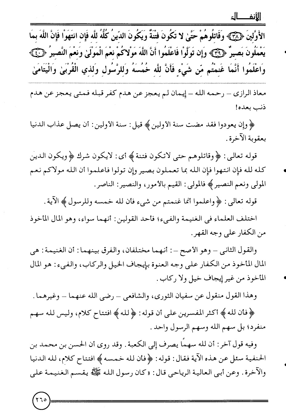 {الْأَوَّلين (38) وقاتلوهم حَتَّى لَا تكون فتْنَة وَيكون الدّين كُله لله فَإِن انْتَهوا فَإِن الله بِمَا يعْملُونَ بَصِير (39) وَإِن توَلّوا فاعلموا أَن الله مولاكم نعم الْمولى وَنعم النصير (40) وَاعْلَمُوا أَنما غَنِمْتُم من شَيْء فَأن لله خمسه وَلِلرَّسُولِ وَلِذِي الْقُرْبَى واليتامى} معَاذ الرَّازِيّ - رَحمَه الله - إِيمَان لم يعجز عَن هدم كفر قبله فَمَتَى يعجز عَن هدم ذَنْب بعده!