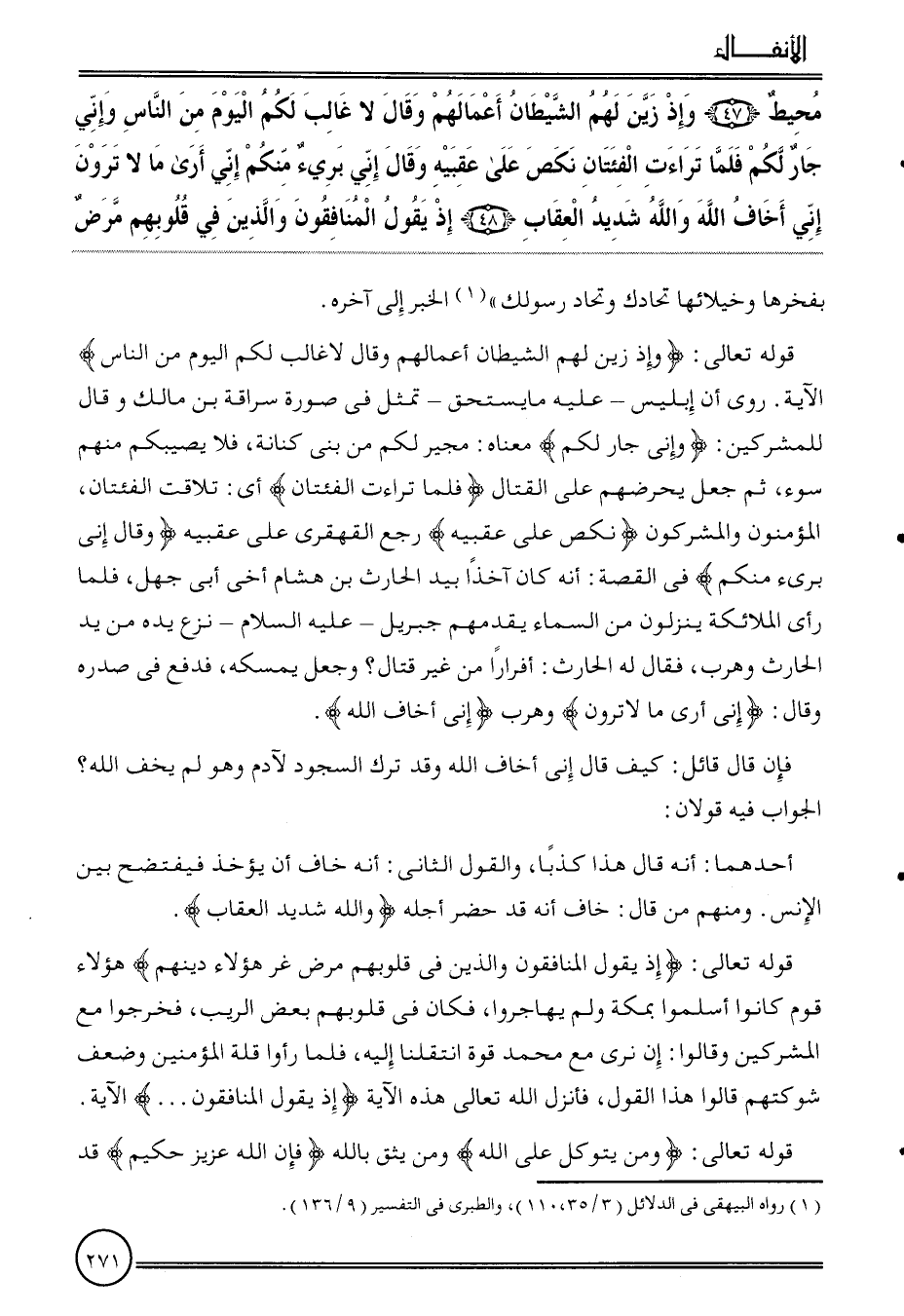 {مُحِيط (47) وَإِذ زين لَهُم الشَّيْطَان أَعْمَالهم وَقَالَ لَا غَالب لكم الْيَوْم من النَّاس وَإِنِّي جَار لكم فَلَمَّا تراءت الفئتان نكص على عَقِبَيْهِ وَقَالَ إِنِّي بَرِيء مِنْكُم وَإِنِّي أرى مَا لَا ترَوْنَ إِنِّي أَخَاف الله وَالله شَدِيد الْعقَاب (48) إِذْ يَقُول المُنَافِقُونَ وَالَّذين فِي قُلُوبهم مرض} بفخرها وخيلائها تُحَادك وتحاد رَسُولك " الْخَبَر إِلَى آخِره.