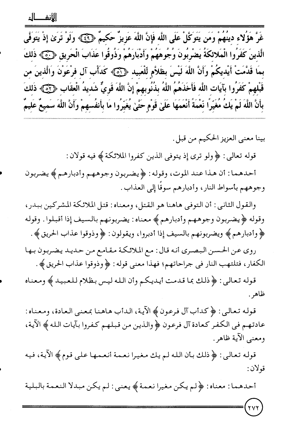 {غر هَؤُلَاءِ دينهم وَمن يتوكل على الله فَإِن الله عَزِيز حَكِيم (49) وَلَو ترى إِذْ يتوفى الَّذين كفرُوا الْمَلَائِكَة يضْربُونَ وُجُوههم وأدبارهم وذوقوا عَذَاب الْحَرِيق (50) ذَلِك بِمَا قدمت أَيْدِيكُم وَأَن الله لَيْسَ بظلام للعبيد (51) كدأب آل فِرْعَوْن وَالَّذين من قبلهم كفرُوا بآيَات الله فَأَخذهُم الله بِذُنُوبِهِمْ إِن الله قوي شَدِيد الْعقَاب (52) ذَلِك بِأَن الله لم يَك مغيرا نعْمَة أنعمها على قوم حَتَّى يُغيرُوا مَا بِأَنْفسِهِم وَأَن الله سميع عليم} بَينا معنى الْعَزِيز الْحَكِيم من قبل.