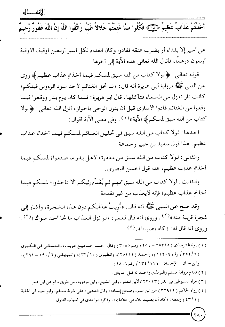 {أَخَذْتُم عَذَاب عَظِيم (68) فَكُلُوا مِمَّا غَنِمْتُم حَلَالا طيبا وَاتَّقوا الله إِن الله غَفُور رَحِيم} عَن أَسِير إِلَّا بِفِدَاء أَو بِضَرْب عُنُقه ففادوا وَكَانَ الْفِدَاء لكل أَسِير أَرْبَعِينَ أُوقِيَّة، الْأُوقِيَّة أَرْبَعُونَ درهما، فَأنْزل الله تَعَالَى هَذِه الْآيَة إِلَى آخرهَا.