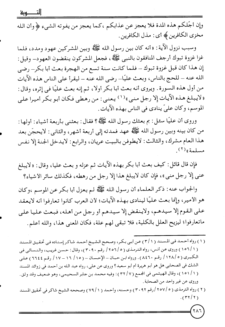 وروى أَن عليا سُئِلَ: بِمَ بَعثك رَسُول الله؟ فَقَالَ: بَعَثَنِي بأَرْبعَة أَشْيَاء: أَولهَا: من كَانَ بَينه وَبَين رَسُول الله عهد فمدته إِلَى أَرْبَعَة أشهر، وَالثَّانِي: لَا يَحُجن بعد هَذَا الْعَام مُشْرك، وَالثَّالِث: لَا يَطُوفَن بِالْبَيْتِ عُرْيَان، وَالرَّابِع: لَا يدْخل الْجنَّة إِلَّا نفس مسلمة ".