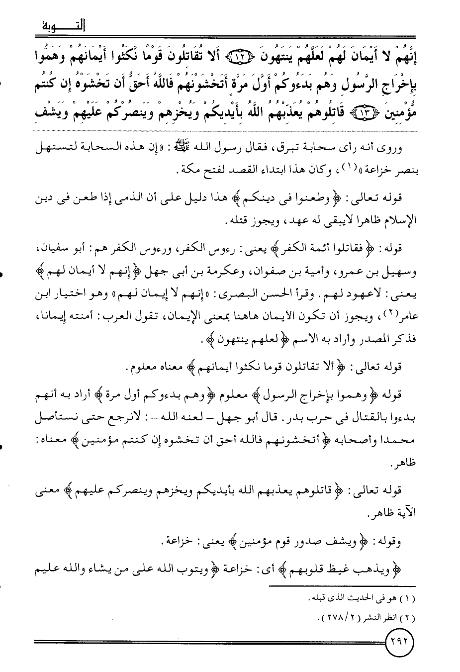{إِنَّهُم لَا أَيْمَان لَهُم لَعَلَّهُم ينتهون (12) أَلا تقاتلون قوما نكثوا أَيْمَانهم وهموا بِإِخْرَاج الرَّسُول وهم بدءوكم أول مرّة أتخشونهم فَالله أَحَق أَن تخشوه إِن كُنْتُم مُؤمنين (13) قاتلوهم يعذبهم الله بِأَيْدِيكُمْ ويخزهم وينصركم عَلَيْهِم ويشف}