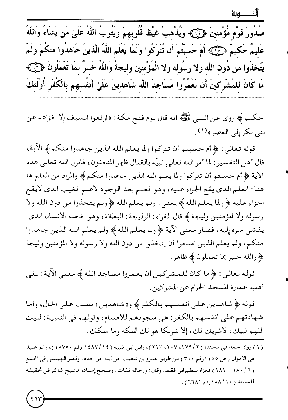 {صُدُور قوم مُؤمنين (14) وَيذْهب غيظ قُلُوبهم وَيَتُوب الله على من يَشَاء وَالله عليم حَكِيم (15) أم حسبتم أَن تتركوا وَلما يعلم الله الَّذين جاهدوا مِنْكُم وَلم يتخذوا من دون الله وَلَا رَسُوله وَلَا الْمُؤمنِينَ وليجة وَالله خَبِير بِمَا تَعْمَلُونَ (16) مَا كَانَ للْمُشْرِكين أَن يعمروا مَسَاجِد الله شَاهِدين على أنفسهم بالْكفْر أُولَئِكَ} حَكِيم) رُوِيَ عَن النَّبِي أَنه قَالَ يَوْم فتح مَكَّة: " ارْفَعُوا السَّيْف إِلَّا خُزَاعَة عَن بني بكر إِلَى الْعَصْر ".