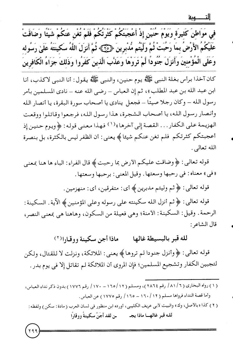{فِي مَوَاطِن كَثِيرَة وَيَوْم حنين إِذْ أَعجبتكُم كثرتكم فَلم تغن عَنْكُم شَيْئا وَضَاقَتْ عَلَيْكُم الأَرْض بِمَا رَحبَتْ ثمَّ وليتم مُدبرين (25) ثمَّ أنزل الله سكينته على رَسُوله وعَلى الْمُؤمنِينَ وَأنزل جُنُودا لم تَرَوْهَا وَعَذَاب الَّذين كفرُوا وَذَلِكَ جَزَاء الْكَافرين} كَانَ آخِذا بِرَأْس بغلة النَّبِي يَوْم حنين، وَالنَّبِيّ يَقُول: أَنا النَّبِي لَا كذب، أَنا ابْن عبد الله بن عبد الْمطلب "، ثمَّ إِن الْعَبَّاس - رَضِي الله عَنهُ - نَادَى الْمُسلمين بِأَمْر رَسُول الله - وَكَانَ رجلا صيتًا - فَجعل يُنَادي يَا أَصْحَاب سُورَة الْبَقَرَة، يَا أنصار الله وأنصار رَسُول الله، يَا أَصْحَاب الشَّجَرَة، هَذَا رَسُول الله، فَرَجَعُوا وقاتلوا وَوَقعت الْهَزِيمَة على الْكفَّار ... الْقِصَّة إِلَى آخرهَا " فَهَذَا معنى قَوْله: {وَيَوْم حنين إِذْ أَعجبتكُم كثرتكم فَلم تغن عَنْكُم شَيْئا} يَعْنِي: أَن الظفر لَيْسَ بِالْكَثْرَةِ، بل بنصرة الله تَعَالَى.