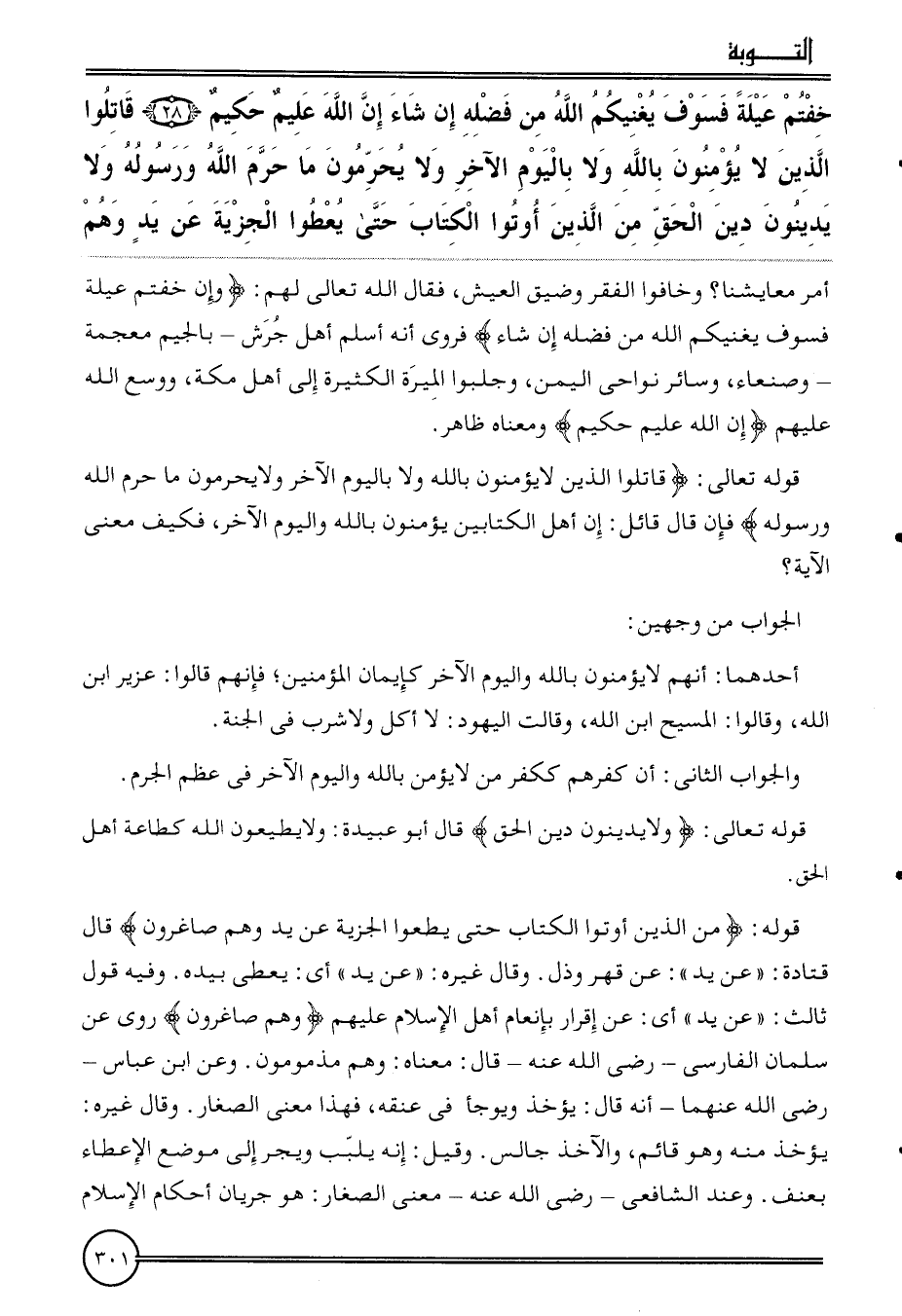 {خِفْتُمْ عيلة فَسَوف يغنيكم الله من فَضله إِن شَاءَ إِن الله عليم حَكِيم (28) قَاتلُوا الَّذين لَا يُؤمنُونَ بِاللَّه وَلَا بِالْيَوْمِ الآخر وَلَا يحرمُونَ مَا حرم الله وَرَسُوله وَلَا يدينون دين الْحق من الَّذين أُوتُوا الْكتاب حَتَّى يُعْطوا الْجِزْيَة عَن يَد وهم} أَمر مَعَايِشنَا؟ وخافوا الْفقر وضيق الْعَيْش، فَقَالَ الله تَعَالَى لَهُم: {وَإِن خِفْتُمْ عيلة فَسَوف يغنيكم الله من فَضله إِن شَاءَ} فَروِيَ أَنه أسلم أهل جرش - بِالْجِيم مُعْجمَة - وَصَنْعَاء، وَسَائِر نواحي الْيمن، وجلبوا الْميرَة الْكَثِيرَة إِلَى أهل مَكَّة، ووسع الله عَلَيْهِم {إِن الله عليم حَكِيم} وَمَعْنَاهُ ظَاهر.