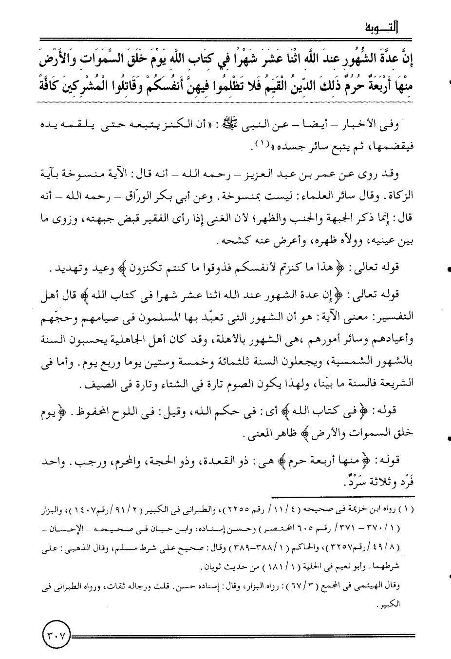 {إِن عدَّة الشُّهُور عِنْد الله اثْنَا عشر شهرا فِي كتاب الله يَوْم خلق السَّمَوَات وَالْأَرْض مِنْهَا أَرْبَعَة حرم ذَلِك الدّين الْقيم فَلَا تظلموا فِيهِنَّ أَنفسكُم وقاتلوا الْمُشْركين كَافَّة}
