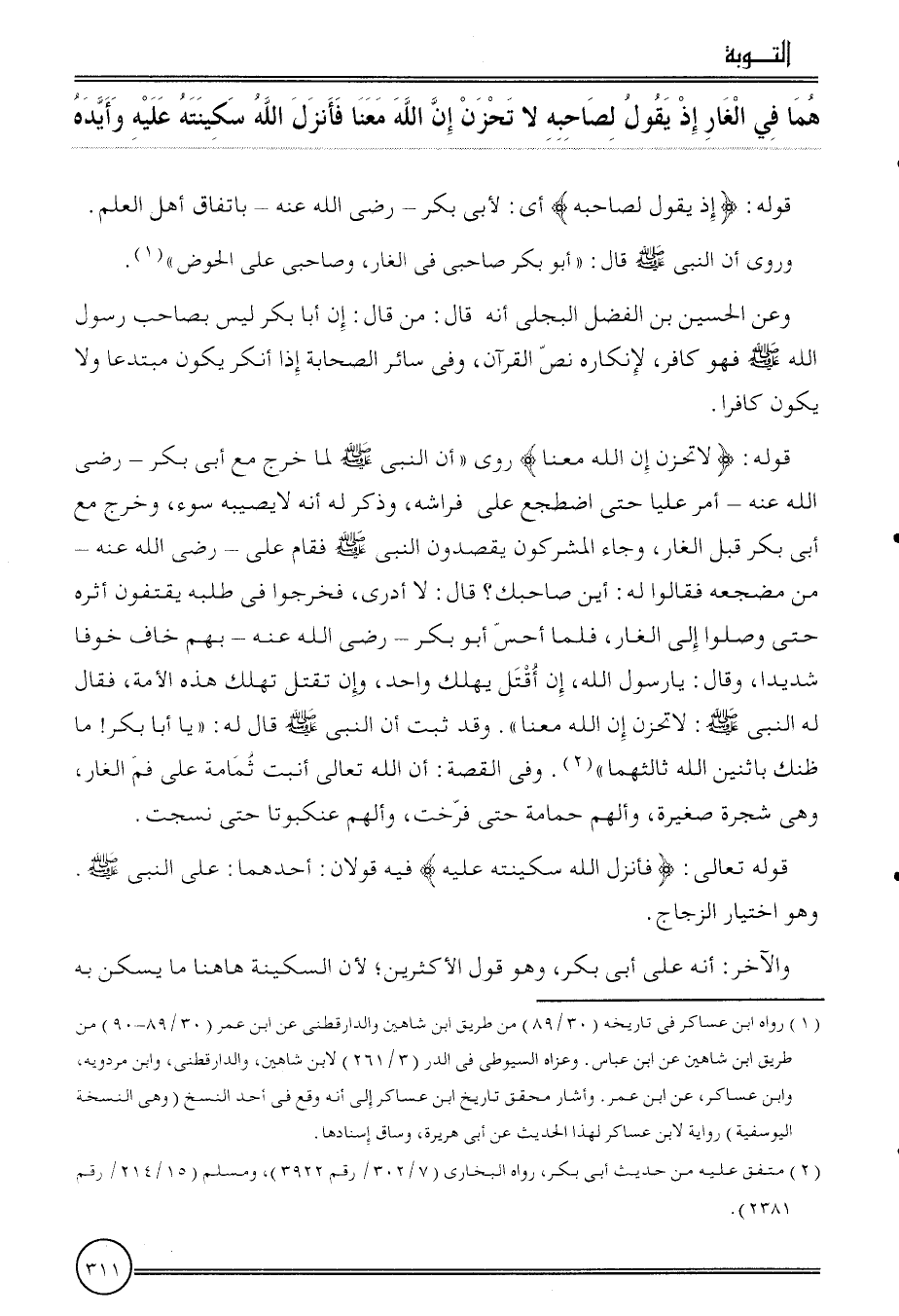 {هما فِي الْغَار إِذْ يَقُول لصَاحبه لَا تحزن إِن الله مَعنا فَأنْزل الله سكينته عَلَيْهِ وأيده}
