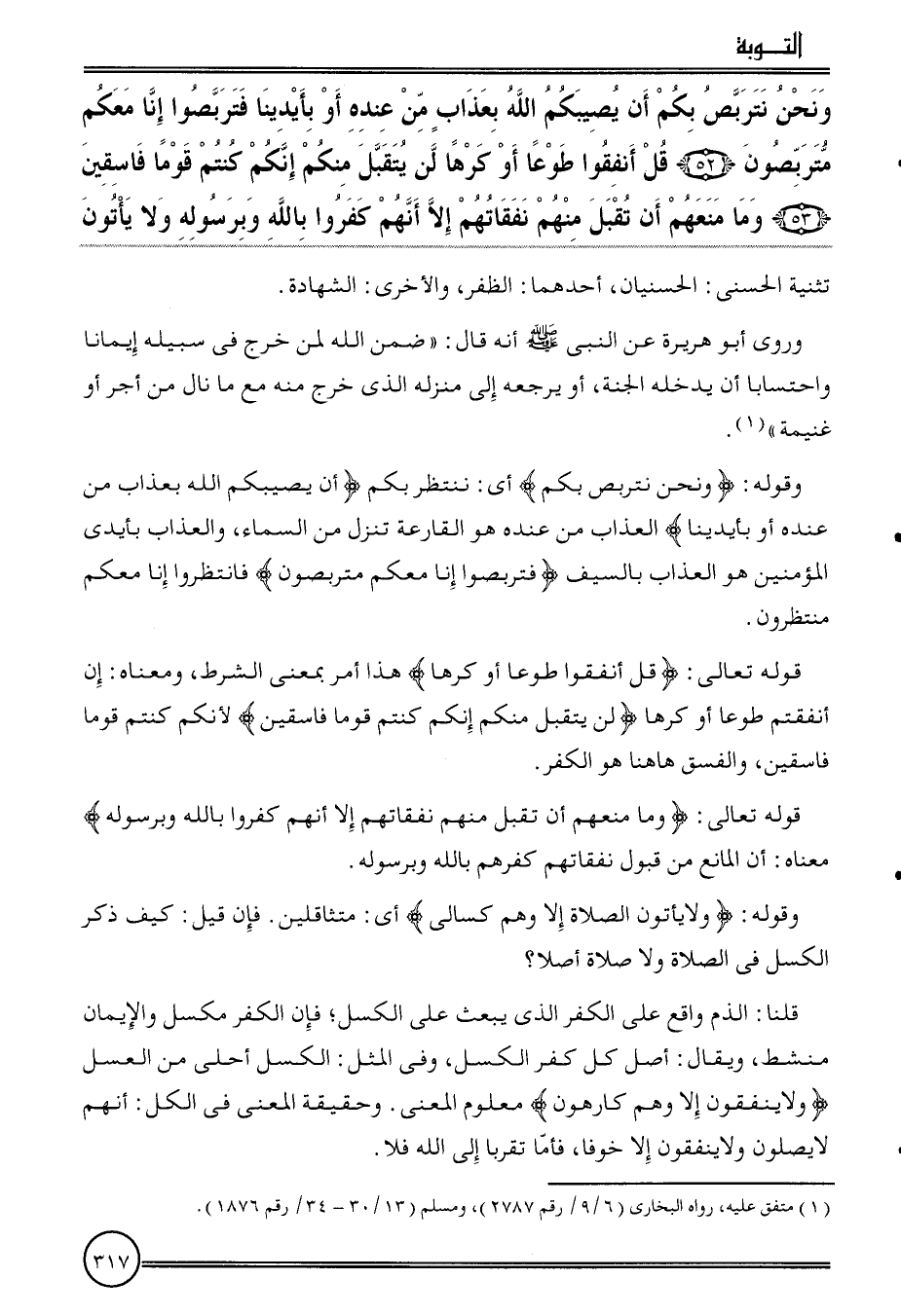 {وَنحن نتربص بكم أَن يُصِيبكُم الله بِعَذَاب من عِنْده أَو بِأَيْدِينَا فتربصوا إِنَّا مَعكُمْ متربصون (52) قل أَنْفقُوا طَوْعًا أَو كرها لن يتَقَبَّل مِنْكُم إِنَّكُم كُنْتُم قوما فاسقين (53) وَمَا مَنعهم أَن تقبل مِنْهُم نفقاتهم إِلَّا أَنهم كفرُوا بِاللَّه وبرسوله وَلَا يأْتونَ} تثنيه الْحسنى: الحسنيان، أَحدهمَا: الظفر، وَالْأُخْرَى: الشَّهَادَة.