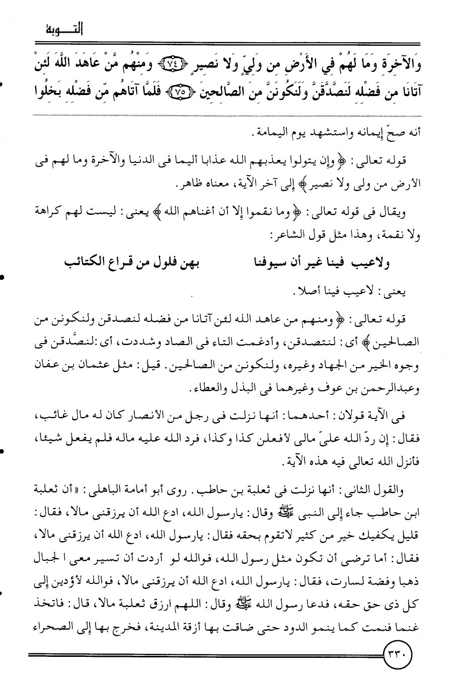 وَالْقَوْل الثَّانِي: أَنَّهَا نزلت فِي ثَعْلَبَة بن حَاطِب. روى أَبُو أُمَامَة الْبَاهِلِيّ: " أَن ثَعْلَبَة ابْن حَاطِب جَاءَ إِلَى النَّبِي وَقَالَ: يَا رَسُول الله، ادْع الله أَن يَرْزُقنِي مَالا، فَقَالَ: قَلِيل يَكْفِيك خير من كثير لَا تقوم بِحقِّهِ فَقَالَ: يَا رَسُول الله، ادْع الله أَن يَرْزُقنِي مَالا، فَقَالَ: أما ترْضى أَن تكون مثل رَسُول الله، فوَاللَّه لَو أردْت أَن تسير معي الْجبَال ذَهَبا وَفِضة لَسَارَتْ، فَقَالَ: يَا رَسُول الله، ادْع الله أَن يَرْزُقنِي مَالا، فوَاللَّه لاؤدين إِلَى كل ذِي حق حَقه، فَدَعَا رَسُول الله وَقَالَ: اللَّهُمَّ ارْزُقْ ثَعْلَبَة مَالا، قَالَ: فَاتخذ غنما فَنمت كَمَا يَنْمُو الدُّود حَتَّى ضَاقَتْ بهَا أَزِقَّة الْمَدِينَة، فَخرج بهَا إِلَى الصَّحرَاء