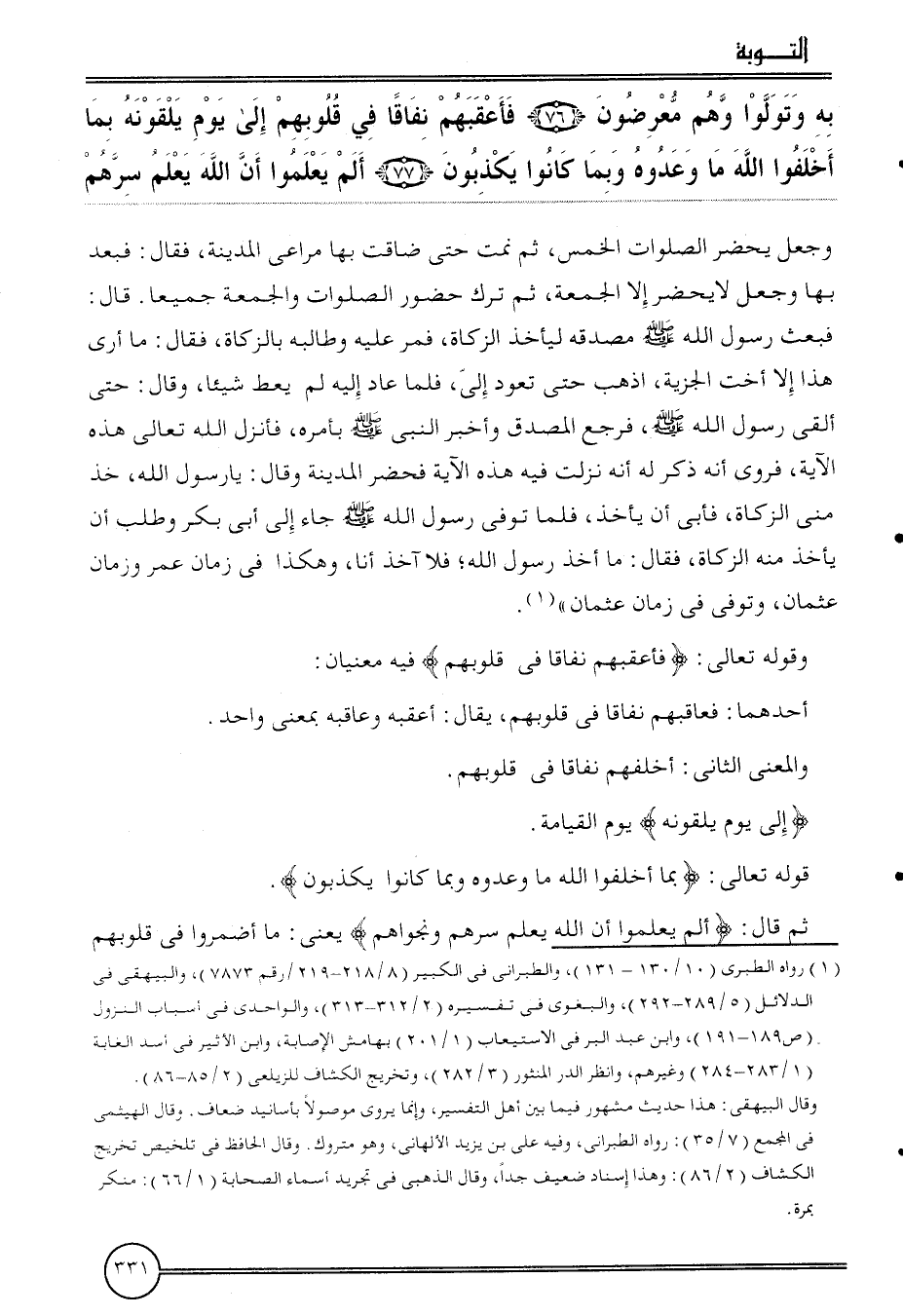 {بِهِ وتولوا وهم معرضون (76) فأعقبهم نفَاقًا فِي قُلُوبهم إِلَى يَوْم يلقونه بِمَا أخْلفُوا الله مَا وعدوه وَبِمَا كَانُوا يكذبُون (77) ألم يعلمُوا أَن الله يعلم سرهم} وَجعل يحضر الصَّلَوَات الْخمس، ثمَّ نمت حَتَّى ضَاقَتْ بهَا مرَاعِي الْمَدِينَة، فَقَالَ فَبعد بهَا وَجعل لَا يحضر إِلَّا الْجُمُعَة، ثمَّ ترك حُضُور الصَّلَوَات وَالْجُمُعَة جَمِيعًا. قَالَ: فَبعث رَسُول الله مصدقه ليَأْخُذ الزَّكَاة، فَمر عَلَيْهِ وطالبه بِالزَّكَاةِ، فَقَالَ: مَا أرى هَذَا إِلَّا أُخْت الْجِزْيَة، اذْهَبْ حَتَّى تعود إِلَيّ، فَلَمَّا عَاد إِلَيْهِ لم يُعْط شَيْئا، وَقَالَ: حَتَّى ألْقى رَسُول الله، فَرجع الْمُصدق وَأخْبر النَّبِي بأَمْره، فَأنْزل الله تَعَالَى هَذِه الْآيَة، فَروِيَ أَنه ذكر لَهُ أَنه نزلت فِيهِ هَذِه الْآيَة فَحَضَرَ الْمَدِينَة وَقَالَ: يَا رَسُول الله، خُذ مني الزَّكَاة، فَأبى أَن يَأْخُذ، فَلَمَّا توفّي رَسُول الله جَاءَ إِلَى أبي بكر وَطلب أَن يَأْخُذ مِنْهُ الزَّكَاة، فَقَالَ: مَا أَخذ رَسُول الله؛ فَلَا آخذ أَنا، وَهَكَذَا فِي زمَان عمر وزمان عُثْمَان، وَتُوفِّي فِي زمَان عُثْمَان ".