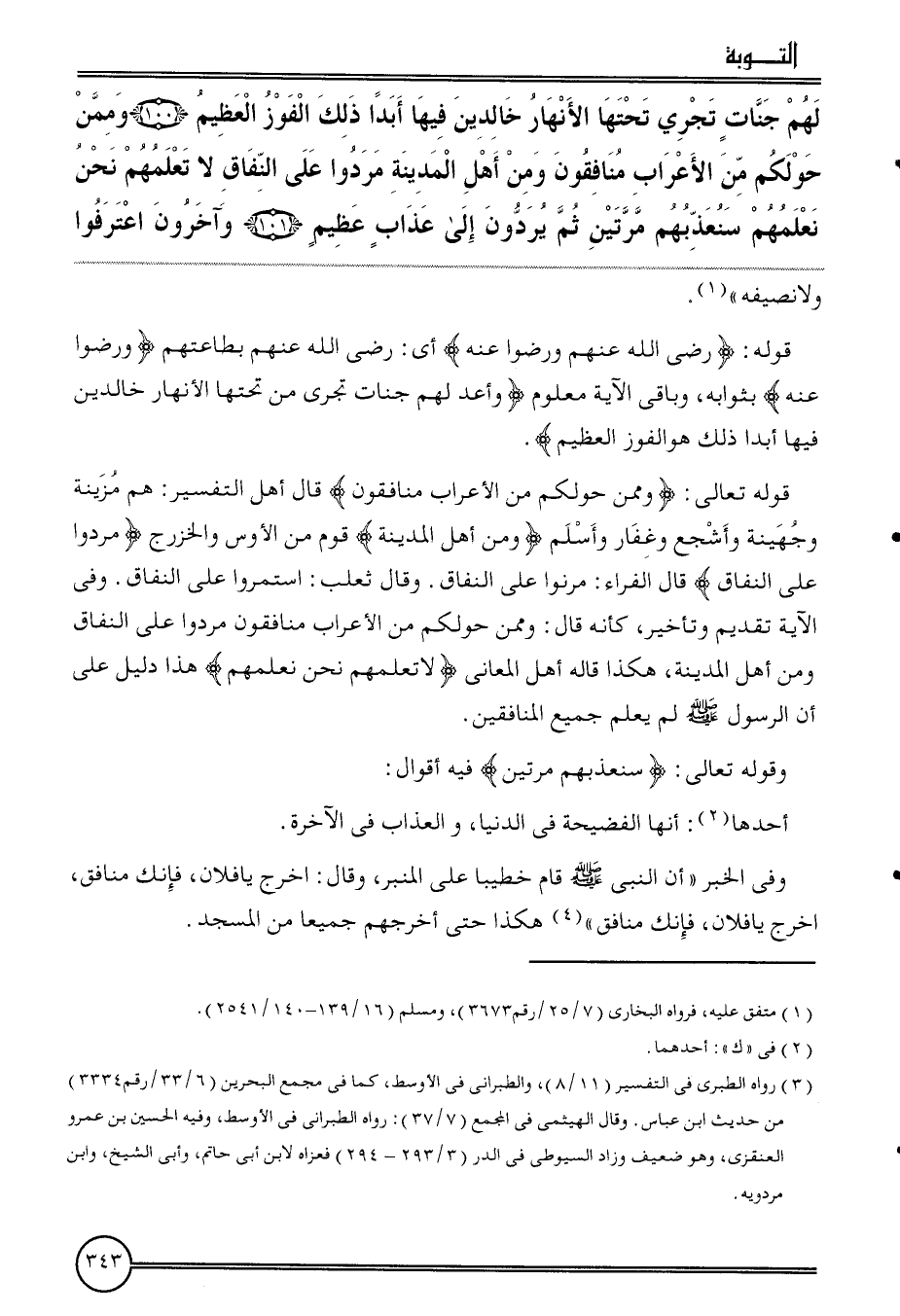 {لَهُم جنَّات تجْرِي تحتهَا الْأَنْهَار خَالِدين فِيهَا أبدا ذَلِك الْفَوْز الْعَظِيم (100) وَمِمَّنْ حَوْلكُمْ من الْأَعْرَاب مُنَافِقُونَ وَمن أهل الْمَدِينَة مَرَدُوا على النِّفَاق لَا تعلمهمْ نَحن نعلمهُمْ سَنُعَذِّبُهُمْ مرَّتَيْنِ ثمَّ يردون إِلَى عَذَاب عَظِيم (101) وَآخَرُونَ اعْتَرَفُوا} وَلَا نصيفه "