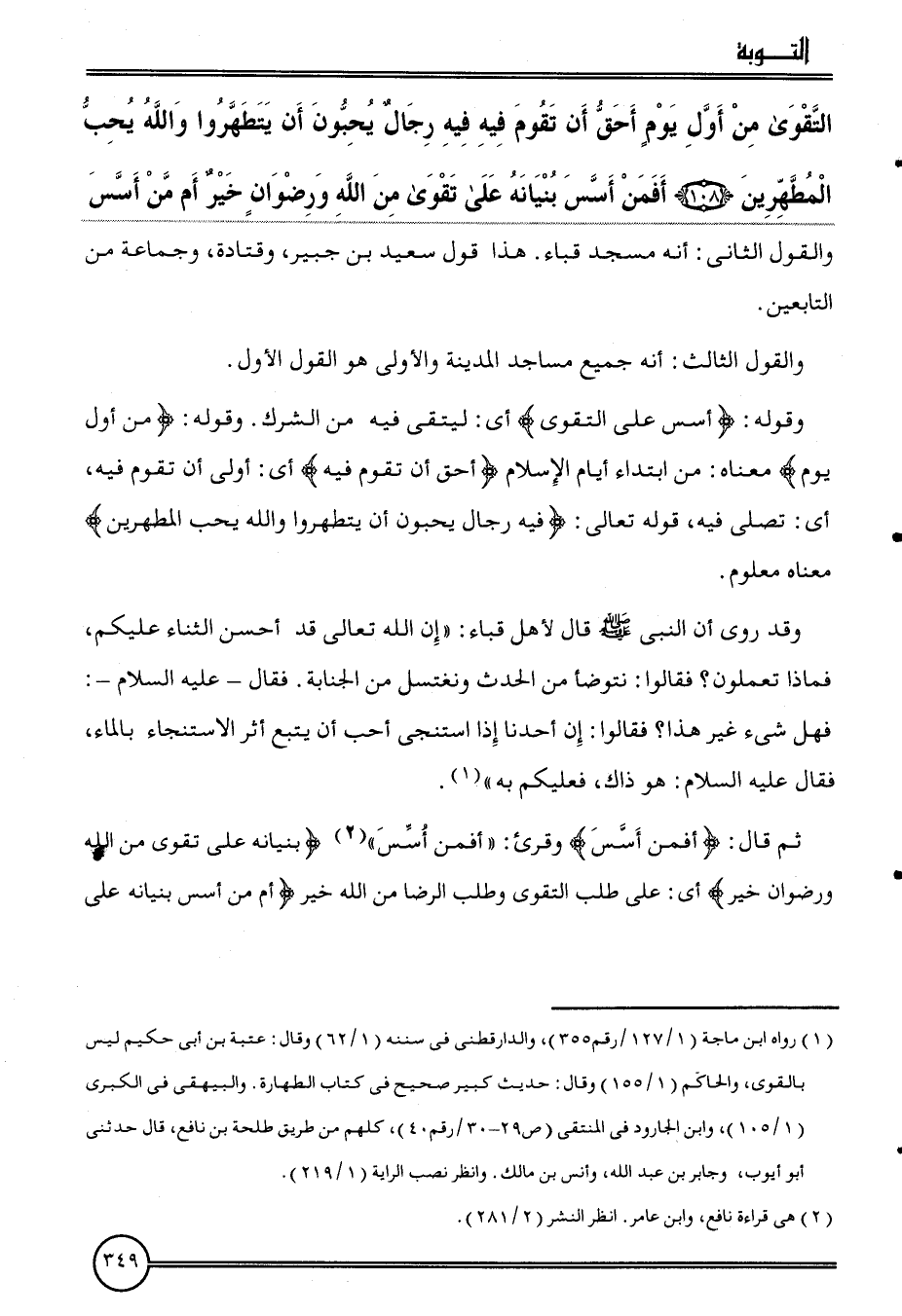 وَقَوله: {أسس على التَّقْوَى} أَي: ليتقى فِيهِ من الشّرك. وَقَوله: {من أول يَوْم} مَعْنَاهُ: من ابْتِدَاء أَيَّام الْإِسْلَام {أَحَق أَن تقوم فِيهِ} أَي: أولى أَن تقوم فِيهِ، أَي: تصلي فِيهِ، قَوْله تَعَالَى: {فِيهِ رجال يحبونَ أَن يَتَطَهَّرُوا وَالله يحب المطهرين} مَعْنَاهُ مَعْلُوم.