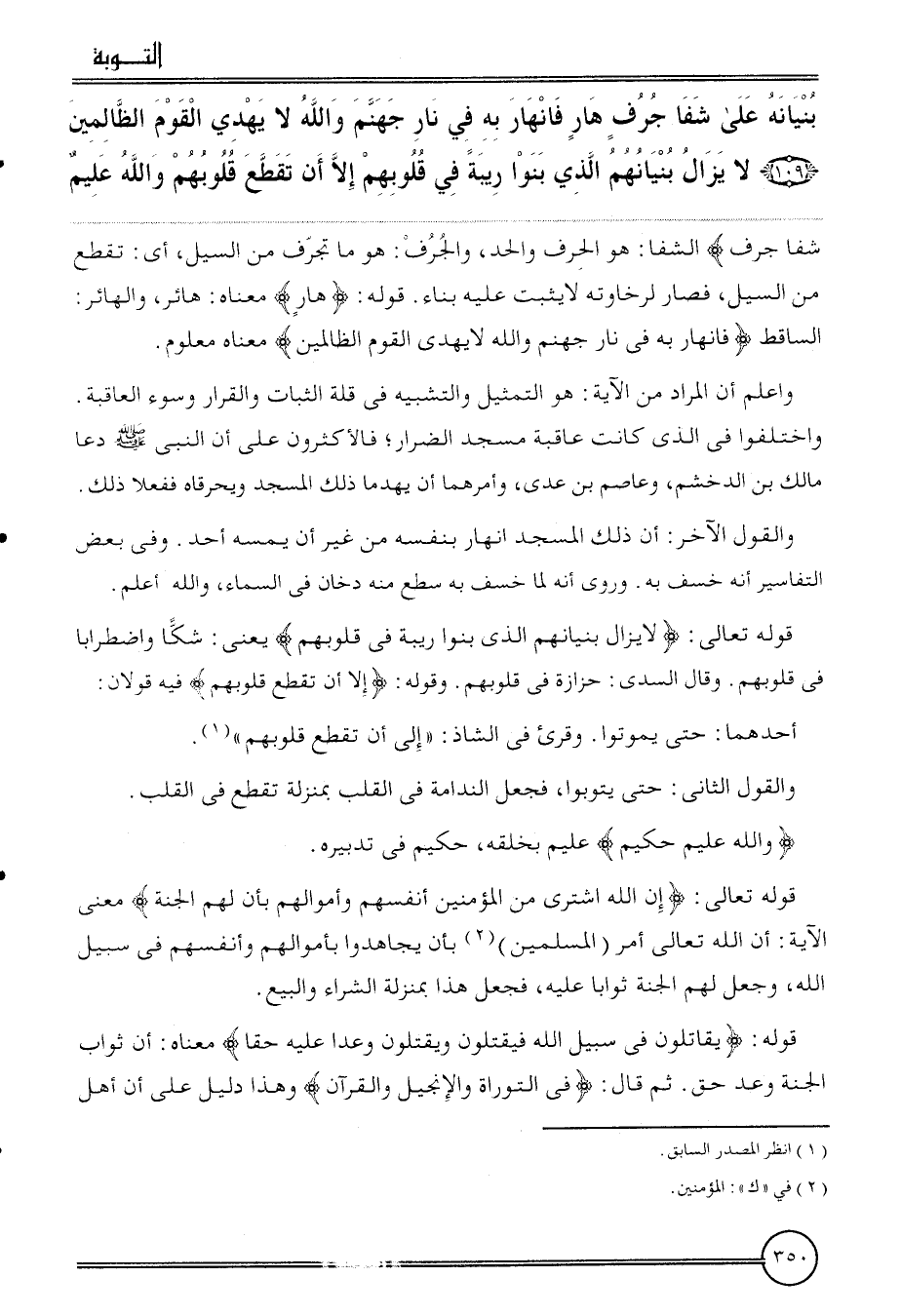 {بُنْيَانه على شفا جرف هار فانهار بِهِ فِي نَار جَهَنَّم وَالله لَا يهدي الْقَوْم الظَّالِمين (109) لَا يزَال بنيانهم الَّذِي بنوا رِيبَة فِي قُلُوبهم إِلَّا أَن تقطع قُلُوبهم وَالله عليم} شفا جرف) الشفا: هُوَ الْحَرْف وَالْحَد، والجرف: هُوَ مَا تجرف من السَّيْل، أَي: تقطع من السَّيْل، فَصَارَ لرخاوته لَا يثبت عَلَيْهِ بِنَاء. قَوْله: {هار} مَعْنَاهُ: هائر، والهائر: السَّاقِط {فانهار بِهِ فِي نَار جَهَنَّم وَالله لَا يهدي الْقَوْم الظَّالِمين} مَعْنَاهُ مَعْلُوم.