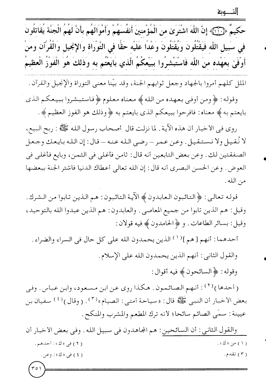 {حَكِيم (110) إِن الله اشْترى من الْمُؤمنِينَ أنفسهم وَأَمْوَالهمْ بِأَن لَهُم الْجنَّة يُقَاتلُون فِي سَبِيل الله فيقتلون وَيقْتلُونَ وَعدا عَلَيْهِ حَقًا فِي التَّوْرَاة وَالْإِنْجِيل وَالْقُرْآن وَمن أوفى بعهده من الله فاستبشروا ببيعكم الَّذِي بايعتم بِهِ وَذَلِكَ هُوَ الْفَوْز الْعَظِيم} الْملَل كلهم أمروا بِالْجِهَادِ وَجعل ثوابهم الْجنَّة، وَقد بَينا معنى التَّوْرَاة وَالْإِنْجِيل وَالْقُرْآن.