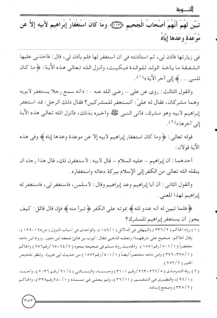 {تبين لَهُم أَنهم أَصْحَاب الْجَحِيم (113) وَمَا كَانَ اسْتِغْفَار إِبْرَاهِيم لِأَبِيهِ إِلَّا عَن موعدة وعدها إِيَّاه} فِي زيارتها فَأذن لي، ثمَّ استأذنته فِي أَن أسْتَغْفر لَهَا فَلم يَأْذَن لي، قَالَ: فأخذني عَلَيْهَا الشَّفَقَة مَا يَأْخُذ الْوَلَد للوالدة فَبَكَيْت، وَأنزل الله تَعَالَى هَذِه الْآيَة: {مَا كَانَ للنَّبِي} إِلَى آخر الْآيَة ".