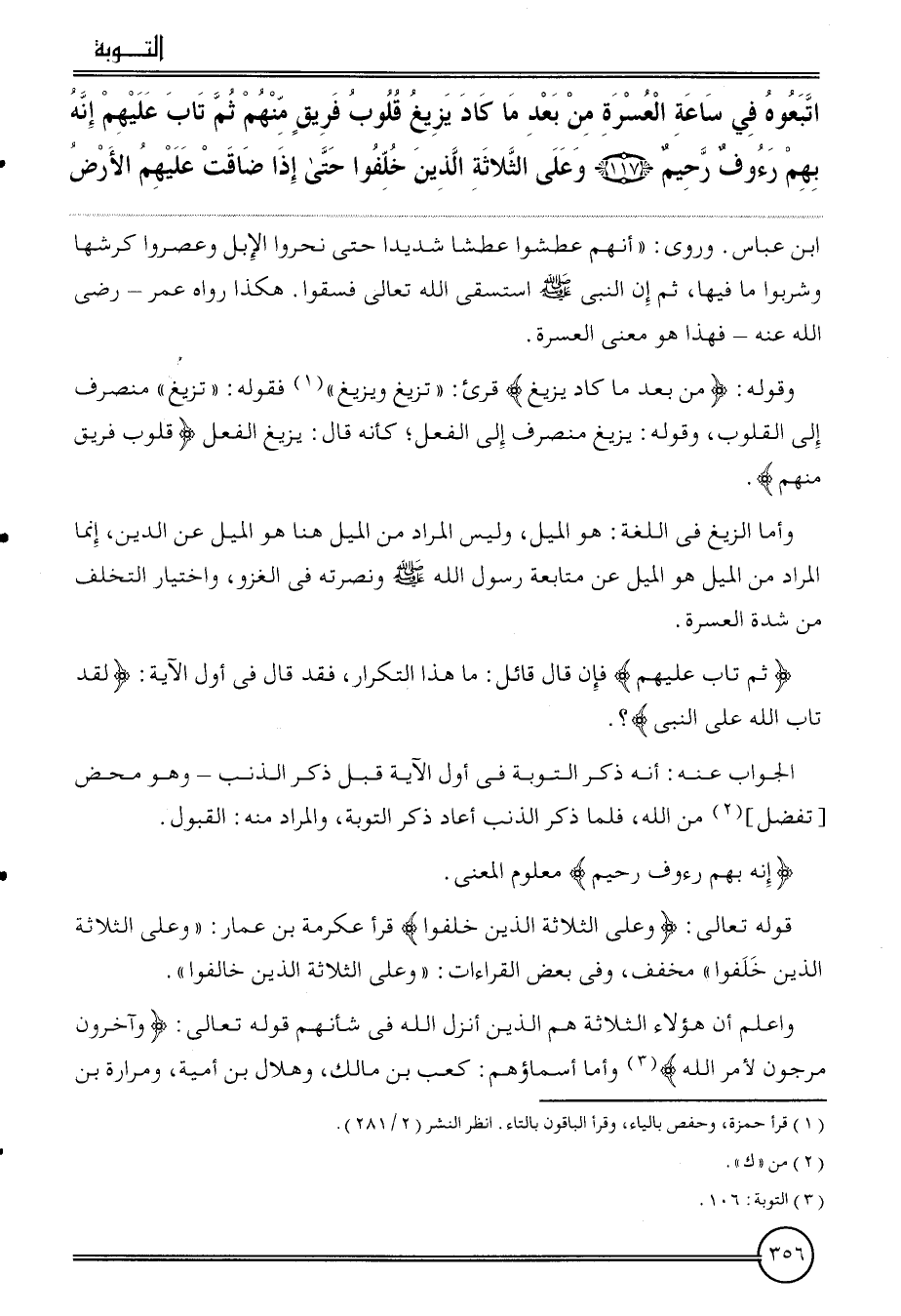 {اتَّبعُوهُ فِي سَاعَة الْعسرَة من بعد مَا كَاد يزِيغ قُلُوب فريق مِنْهُم ثمَّ تَابَ عَلَيْهِم إِنَّه بهم رءوف رَحِيم (117) وعَلى الثَّلَاثَة الَّذين خلفوا حَتَّى إِذا ضَاقَتْ عَلَيْهِم الأَرْض} ابْن عَبَّاس. وَرُوِيَ: " أَنهم عطشوا عطشا شَدِيدا حَتَّى نحرُوا الْإِبِل وعصروا كرشها وَشَرِبُوا مَا فِيهَا، ثمَّ إِن النَّبِي استسقى الله تَعَالَى فسقوا. هَكَذَا رَوَاهُ عمر - رَضِي الله عَنهُ - فَهَذَا هُوَ معنى الْعسرَة.