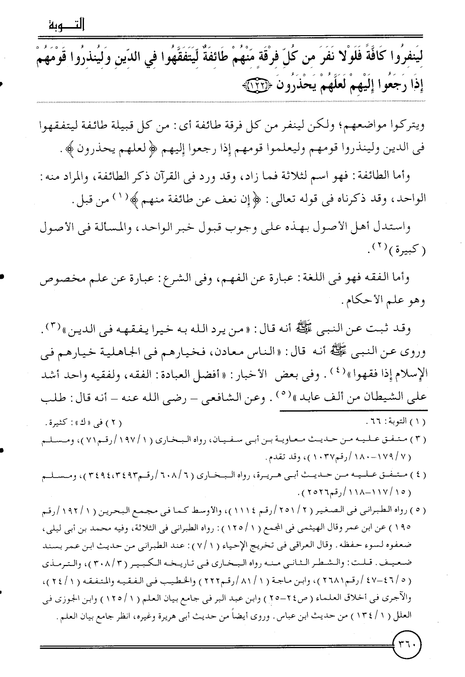 {لينفروا كَافَّة فلولا نفر من كل فرقة مِنْهُم طَائِفَة ليتفقهوا فِي الدّين ولينذروا قَومهمْ إِذا رجعُوا إِلَيْهِم لَعَلَّهُم يحذرون (122) } ويتركوا مواضعهم؛ وَلَكِن لينفر من كل فرقة طَائِفَة أَي: من كل قَبيلَة طَائِفَة ليتفقهوا فِي الدّين ولينذروا قَومهمْ وليعلموا قَومهمْ إِذا رجعُوا إِلَيْهِم {لَعَلَّهُم يحذرون} .