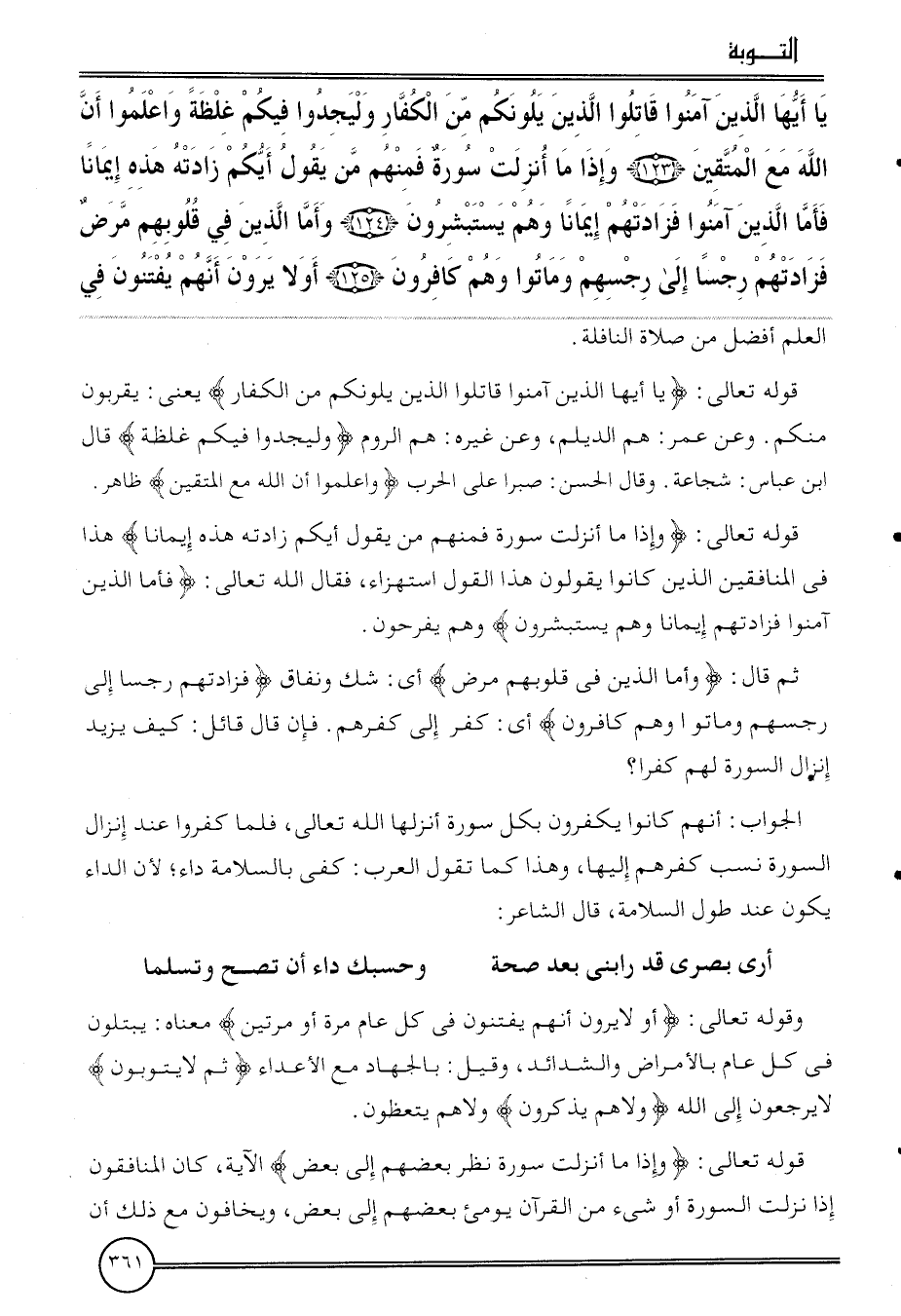 {يَا أَيهَا الَّذين آمنُوا قَاتلُوا الَّذين يلونكم من الْكفَّار وليجدوا فِيكُم غلظة وَاعْلَمُوا أَن الله مَعَ الْمُتَّقِينَ (123) وَإِذا مَا أنزلت سُورَة فَمنهمْ من يَقُول أَيّكُم زادته هَذِه إِيمَانًا فَأَما الَّذين آمنُوا فزادتهم إِيمَانًا وهم يستبشرون (124) وَأما الَّذين فِي قُلُوبهم مرض فزادتهم رجسا إِلَى رجسهم وماتوا وهم كافرون (125) أَولا يرَوْنَ أَنهم يفتنون فِي} الْعلم أفضل من صَلَاة النَّافِلَة.