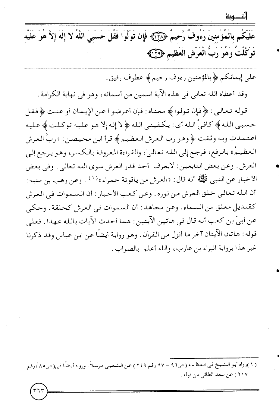 {عَلَيْكُم بِالْمُؤْمِنِينَ رءوف رَحِيم (128) فَإِن توَلّوا فَقل حسبي الله لَا إِلَه إِلَّا هُوَ عَلَيْهِ توكلت وَهُوَ رب الْعَرْش الْعَظِيم (129) } على إيمَانكُمْ {بِالْمُؤْمِنِينَ رءوف رَحِيم} عطوف رَفِيق.