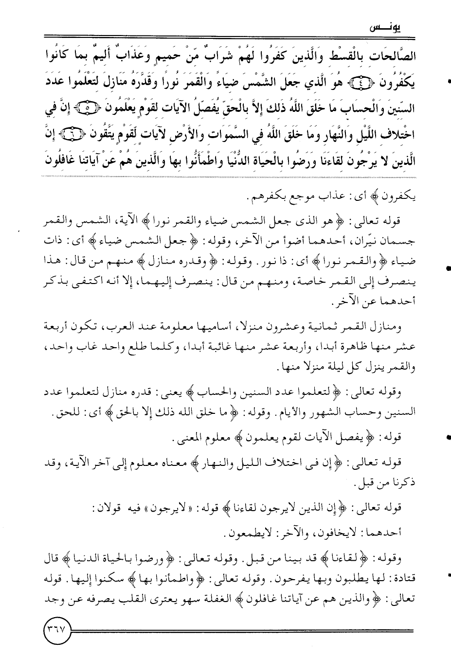{الصَّالِحَات بِالْقِسْطِ وَالَّذين كفرُوا لَهُم شراب من حميم وَعَذَاب أَلِيم بِمَا كَانُوا يكفرون (4) هُوَ الَّذِي جعل الشَّمْس ضِيَاء وَالْقَمَر نورا وَقدره منَازِل لِتَعْلَمُوا عدد السنين والحساب مَا خلق الله ذَلِك إِلَّا بِالْحَقِّ يفصل الْآيَات لقوم يعلمُونَ (5) إِن فِي اخْتِلَاف اللَّيْل وَالنَّهَار وَمَا خلق الله فِي السَّمَوَات وَالْأَرْض لآيَات لقوم يَتَّقُونَ (6) إِن الَّذين لَا يرجون لقاءنا وَرَضوا بِالْحَيَاةِ الدُّنْيَا واطمأنوا بهَا وَالَّذين هم عَن أياتنا غافلون} أَي: عَذَاب موجع بكفرهم.