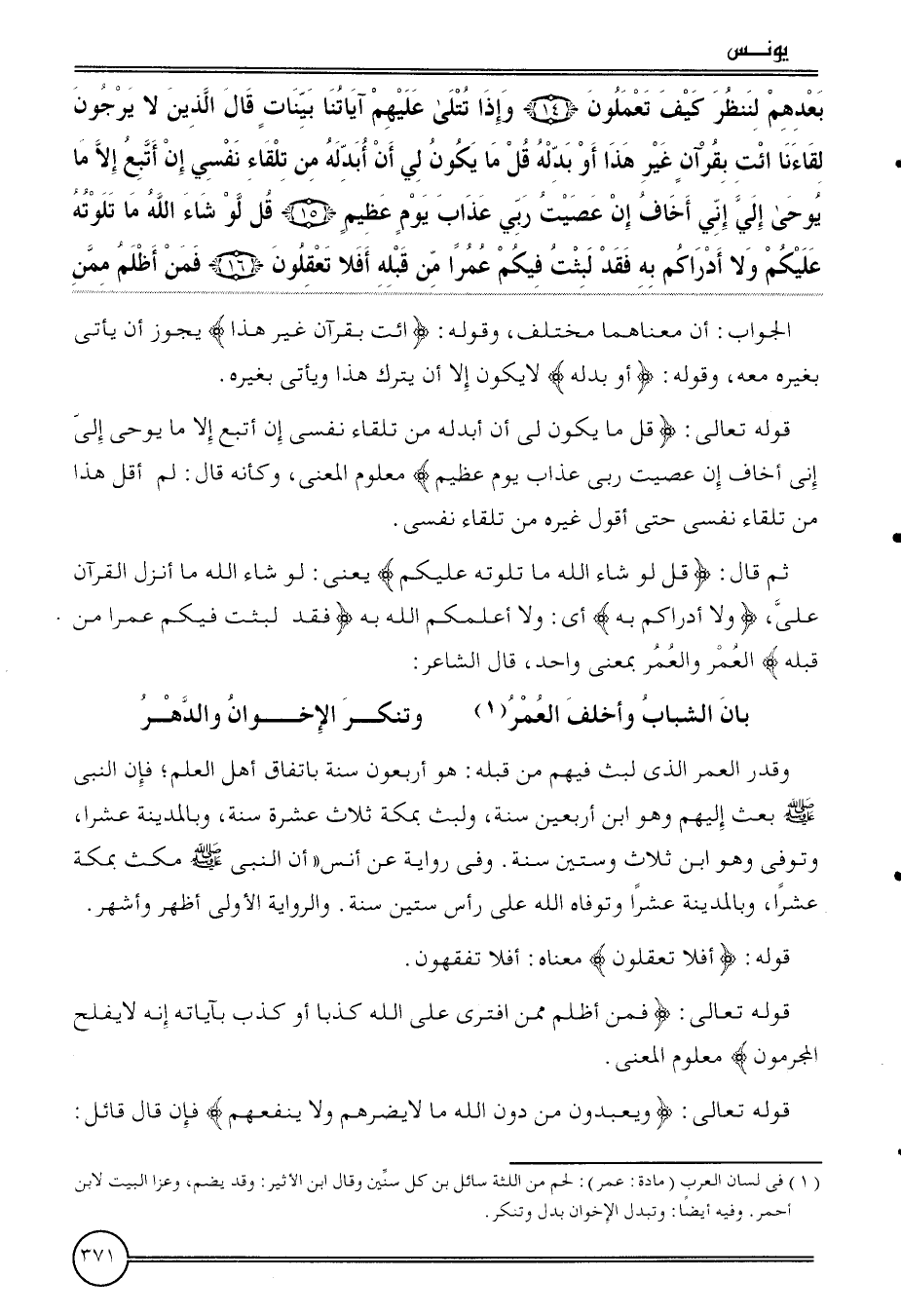 وَقدر الْعُمر الَّذِي لبث فيهم من قبله: هُوَ أَرْبَعُونَ سنة بِاتِّفَاق أهل الْعلم؛ فَإِن النَّبِي بعث إِلَيْهِم وَهُوَ ابْن أَرْبَعِينَ سنة، ولبث بِمَكَّة ثَلَاث عشرَة سنة، وبالمدينة عشرا، وَتُوفِّي وَهُوَ ابْن ثَلَاث وَسِتِّينَ سنة. وَفِي رِوَايَة عَن أنس " أَن النَّبِي مكث بِمَكَّة عشرا، وبالمدينة عشرا وتوفاه الله على رَأس سِتِّينَ سنة. وَالرِّوَايَة الأولى أظهر وَأشهر.