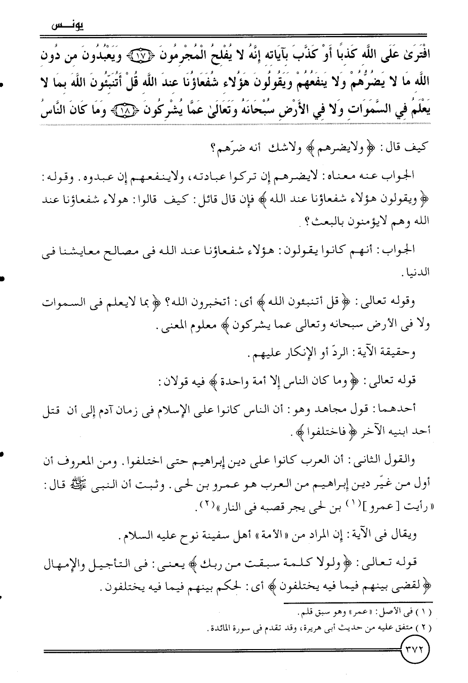 الْجَواب عَنهُ مَعْنَاهُ: لَا يضرهم إِن تركُوا عِبَادَته، وَلَا يَنْفَعهُمْ إِن عبدوه. وَقَوله: {وَيَقُولُونَ هَؤُلَاءِ شفعاؤنا عِنْد الله} فَإِن قَالَ قَائِل: كَيفَ قَالُوا: هَؤُلَاءِ شفعاؤنا عِنْد الله وهم لَا يُؤمنُونَ بِالْبَعْثِ؟ .
