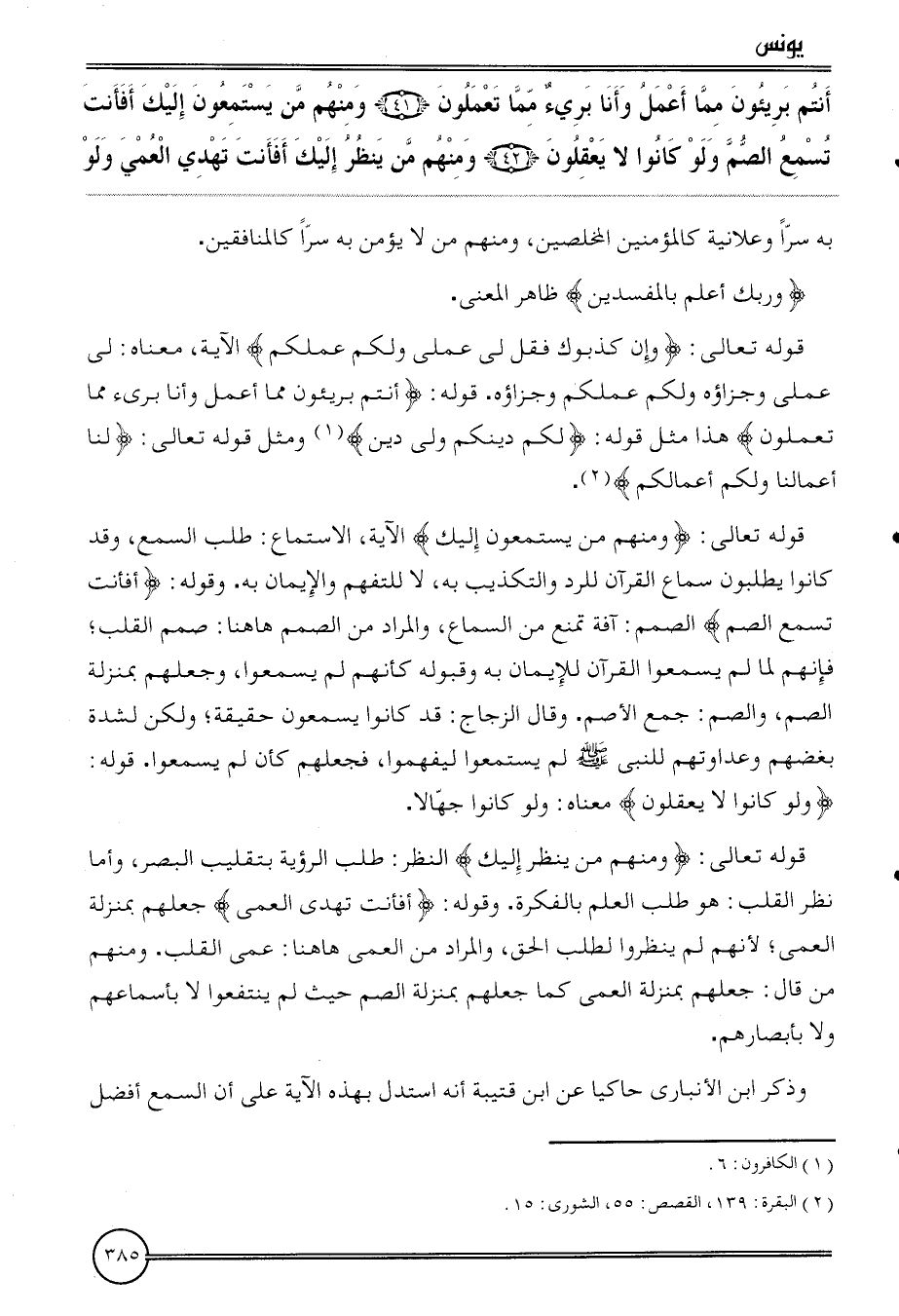 {أَنْتُم بريئون مِمَّا أعمل وَأَنا بَرِيء مِمَّا تَعْمَلُونَ (41) وَمِنْهُم من يَسْتَمِعُون إِلَيْك أفأنت تسمع الصم وَلَو كَانُوا لَا يعْقلُونَ (42) وَمِنْهُم من ينظر إِلَيْك أفأنت تهدي الْعمي وَلَو} بِهِ سرا وَعَلَانِيَة كالمؤمنين المخلصين، وَمِنْهُم من لَا يُؤمن بِهِ سرا كالمنافقين.