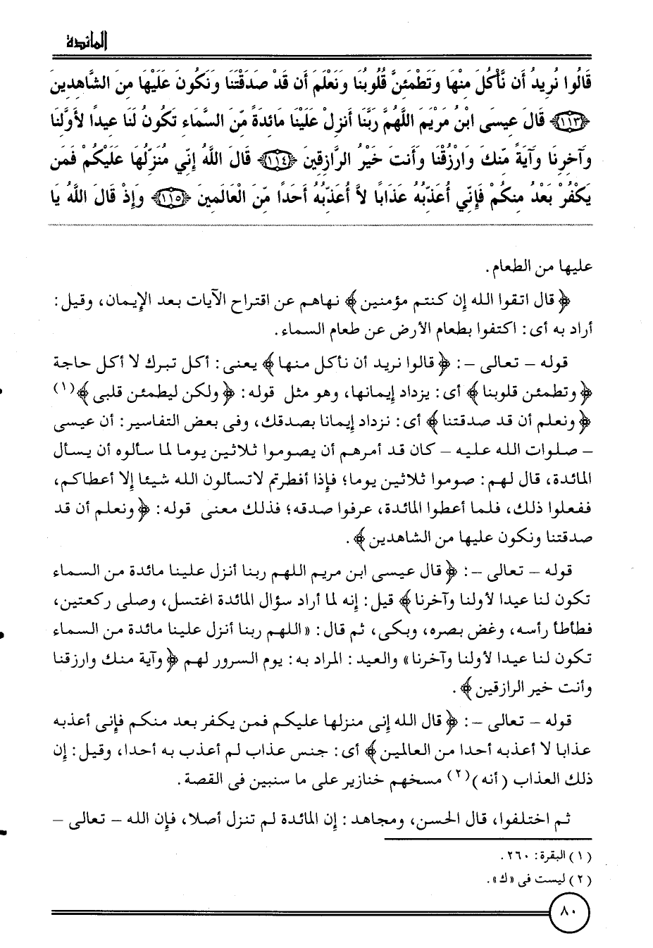 {قَالُوا نُرِيد أَن نَأْكُل مِنْهَا وتطمئن قُلُوبنَا ونعلم أَن قد صدقتنا ونكون عَلَيْهَا من الشَّاهِدين (113) قَالَ عِيسَى ابْن مَرْيَم اللَّهُمَّ رَبنَا أنزل علينا مائدة من السَّمَاء تكون لنا عيدا لأولنا وآخرنا وَآيَة مِنْك وارزقنا وَأَنت خير الرازقين (114) قَالَ الله إِنِّي منزلهَا عَلَيْكُم فَمن يكفر بعد مِنْكُم فَإِنِّي أعذبه عذَابا لَا أعذبه أحدا من الْعَالمين (115) وَإِذ قَالَ الله يَا} عَلَيْهَا من الطَّعَام.