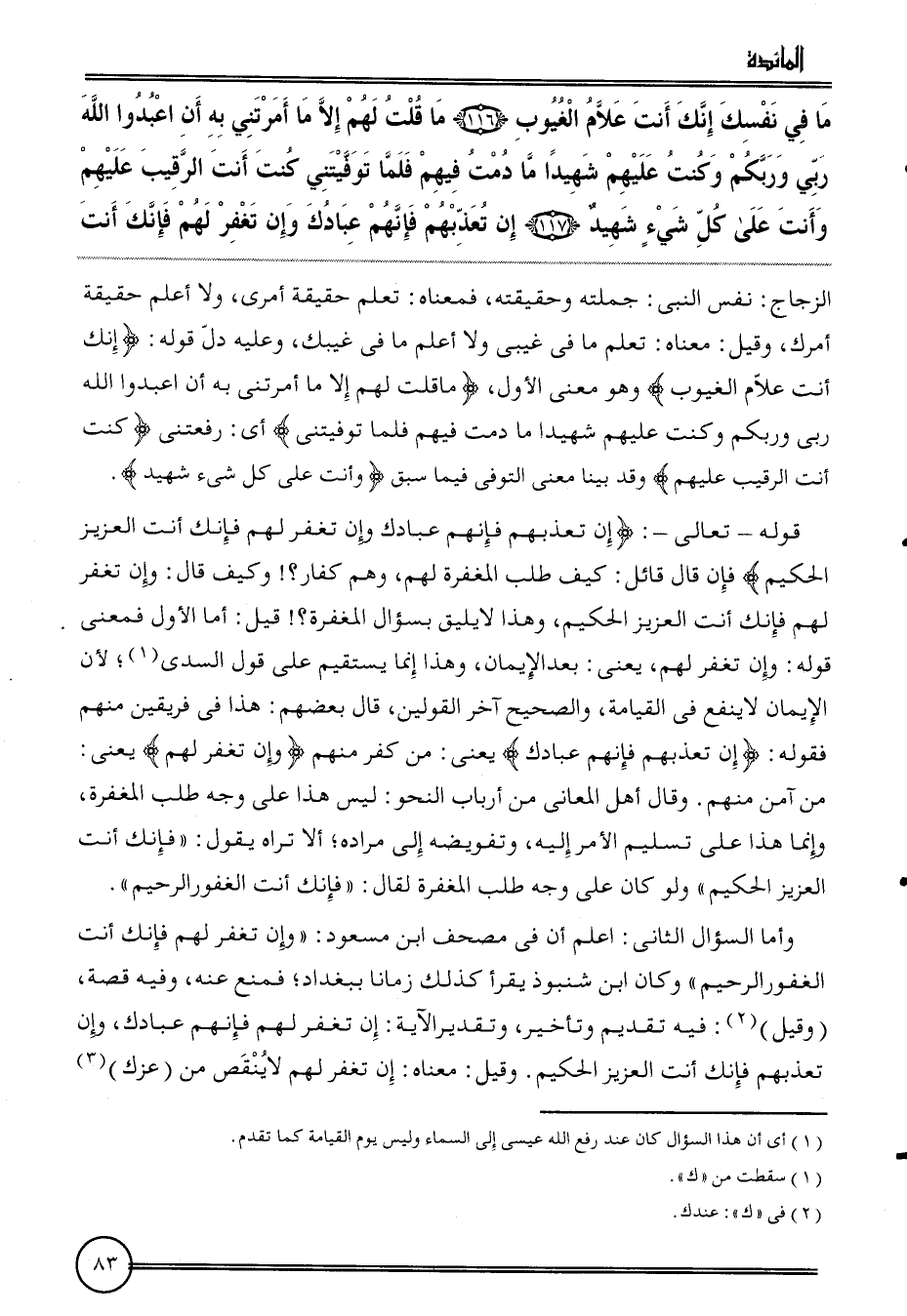 {مَا فِي نَفسك إِنَّك أَنْت علام الغيوب (116) مَا قلت لَهُم إِلَّا مَا أَمرتنِي بِهِ أَن اعبدوا الله رَبِّي وربكم وَكنت عَلَيْهِم شَهِيدا مَا دمت فيهم فَلَمَّا توفيتني كنت أَنْت الرَّقِيب عَلَيْهِم وَأَنت على كل شَيْء شَهِيد (117) إِن تُعَذبهُمْ فَإِنَّهُم عِبَادك وَإِن تغْفر لَهُم فَإنَّك أَنْت} الزّجاج: نفس النَّبِي: جملَته وَحَقِيقَته، فَمَعْنَاه: تعلم حَقِيقَة أَمْرِي، وَلَا أعلم حَقِيقَة أَمرك، وَقيل: مَعْنَاهُ: تعلم مَا فِي غيبي وَلَا أعلم مَا فِي غيبك، وَعَلِيهِ دلّ قَوْله: {إِنَّك أَنْت علام الغيوب} وَهُوَ معنى الأول،