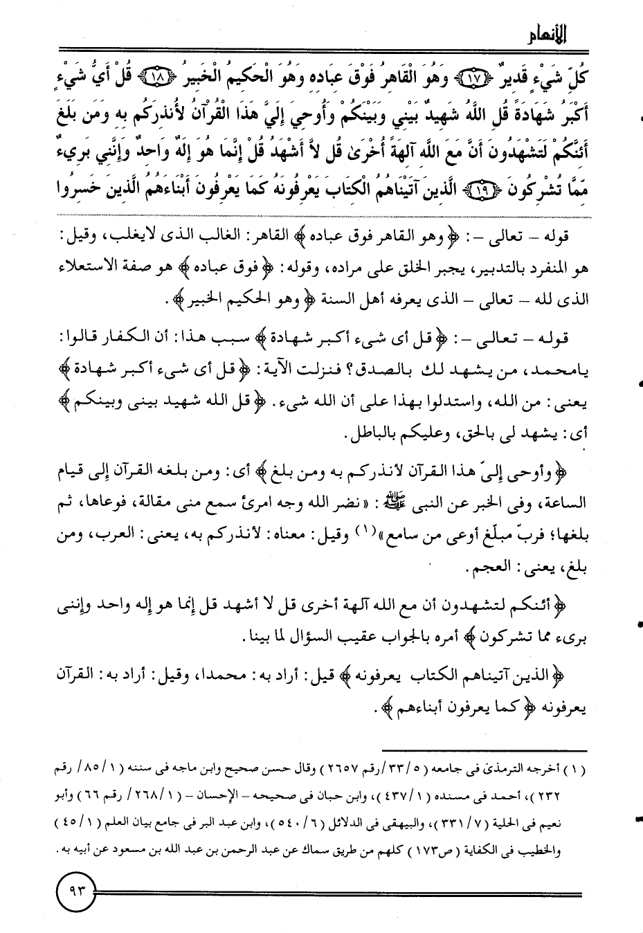 {كل شَيْء قدير (17) وَهُوَ القاهر فَوق عباده وَهُوَ الْحَكِيم الْخَبِير (18) قل أَي شَيْء أكبر شَهَادَة قل الله شَهِيد بيني وَبَيْنكُم وأوحي إِلَيّ هَذَا الْقُرْآن لأنذركم بِهِ وَمن بلغ أئنكم لتشهدون أَن مَعَ الله آلِهَة أُخْرَى قل لَا أشهد قل إِنَّمَا هُوَ إِلَه وَاحِد وإنني بَرِيء مِمَّا تشركون (19) الَّذين آتَيْنَاهُم الْكتاب يعرفونه كَمَا يعْرفُونَ أَبْنَاءَهُم الَّذين خسروا}