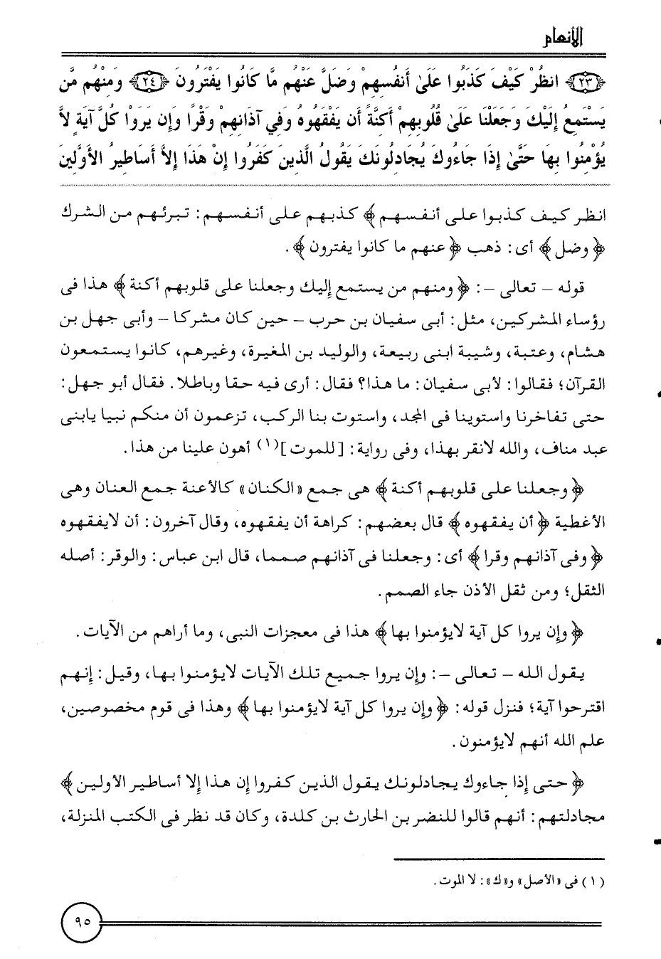 ( {23) انْظُر كَيفَ كذبُوا على أنفسهم وضل عَنْهُم مَا كَانُوا يفترون (24) وَمِنْهُم من يستمع إِلَيْك وَجَعَلنَا على قُلُوبهم أكنة أَن يفقهوه وَفِي آذانهم وقرا وَإِن يرَوا كل آيَة لَا يُؤمنُوا بهَا حَتَّى إِذا جاءوك يجادلونك يَقُول الَّذين كفرُوا إِن هَذَا إِلَّا أساطير الْأَوَّلين}