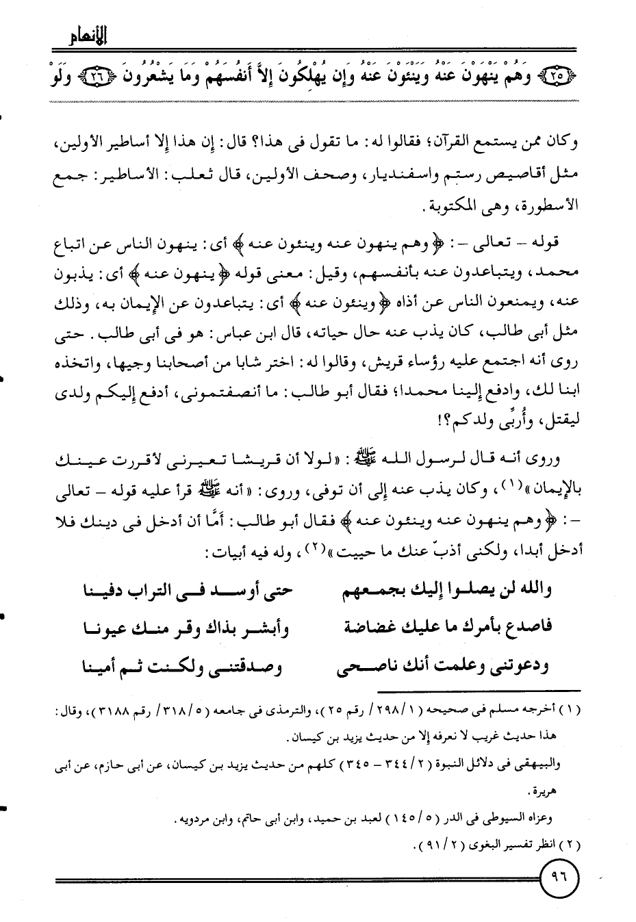 قَوْله - تَعَالَى -: {وهم ينهون عَنهُ وينئون عَنهُ} أَي: ينهون النَّاس عَن اتِّبَاع مُحَمَّد، وتباعدون عَنهُ بِأَنْفسِهِم، وَقيل: معنى قَوْله {ينهون عَنهُ} أَي: يَذبُّونَ عَنهُ، وَيمْنَعُونَ النَّاس عَن أَذَاهُ {وينئون عَنهُ} أَي: يتباعدون عَن الْإِيمَان بِهِ، وَذَلِكَ مثل أبي طَالب، كَانَ يذب عَنهُ حَال حَيَاته، قَالَ ابْن عَبَّاس: هُوَ فِي أبي طَالب. حَتَّى روى أَنه اجْتمع عَلَيْهِ رُؤَسَاء قُرَيْش، وَقَالُوا لَهُ: اختر شَابًّا من أَصْحَابنَا وجيها، واتخذه ابْنا لَك، وادفع إِلَيْنَا مُحَمَّدًا؛ فَقَالَ أَبُو طَالب: مَا أنصفتموني، أدفَع إِلَيْكُم وَلَدي ليقْتل، وأربي ولدكم؟ !