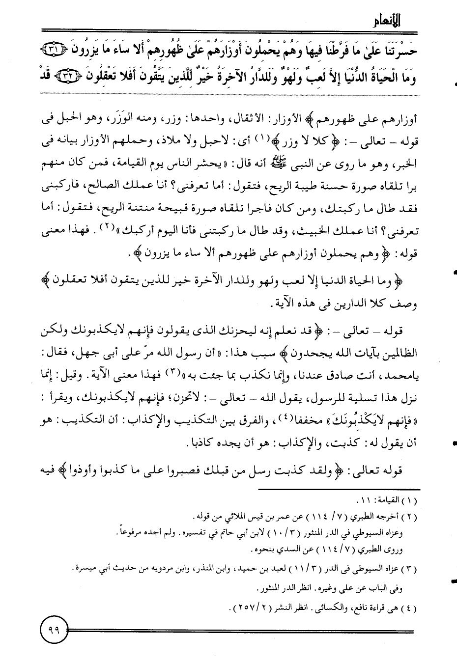 {حسرتنا على مَا فرطنا فِيهَا وهم يحملون أوزارهم على ظُهُورهمْ أَلا سَاءَ مَا يزرون (31) وَمَا الْحَيَاة الدُّنْيَا إِلَّا لعب وَلَهو وللدار الْآخِرَة خير للَّذين يَتَّقُونَ أَفلا تعقلون (32) قد} أوزارهم على ظُهُورهمْ) الأوزار: الأثقال، وَاحِدهَا: وزر، وَمِنْه الْوزر، وَهُوَ الْحَبل فِي قَوْله - تَعَالَى -: {كلا لَا وزر} أَي: لَا حَبل وَلَا ملاذ، وَحَملهمْ الأوزار بَيَانه فِي الْخَبَر، وَهُوَ مَا روى عَن النَّبِي أَنه قَالَ: " يحْشر النَّاس يَوْم الْقِيَامَة، فَمن كَانَ مِنْهُم برا تَلقاهُ صُورَة حَسَنَة طيبَة الرّيح، فَتَقول: أما تعرفنِي؟ أَنا عَمَلك الصَّالح، فاركبني فقد طَال مَا ركبتك، وَمن كَانَ فَاجِرًا تَلقاهُ صُورَة قبيحة مُنْتِنَة الرّيح، فَتَقول: أما تعرفنِي؟ أَنا عَمَلك الْخَبيث، وَقد طَال مَا ركبتني فَأَنا الْيَوْم أركبك ". فَهَذَا معنى قَوْله: ( {وهم يحملون أوزارهم على ظُهُورهمْ أَلا سَاءَ مَا يزرون}