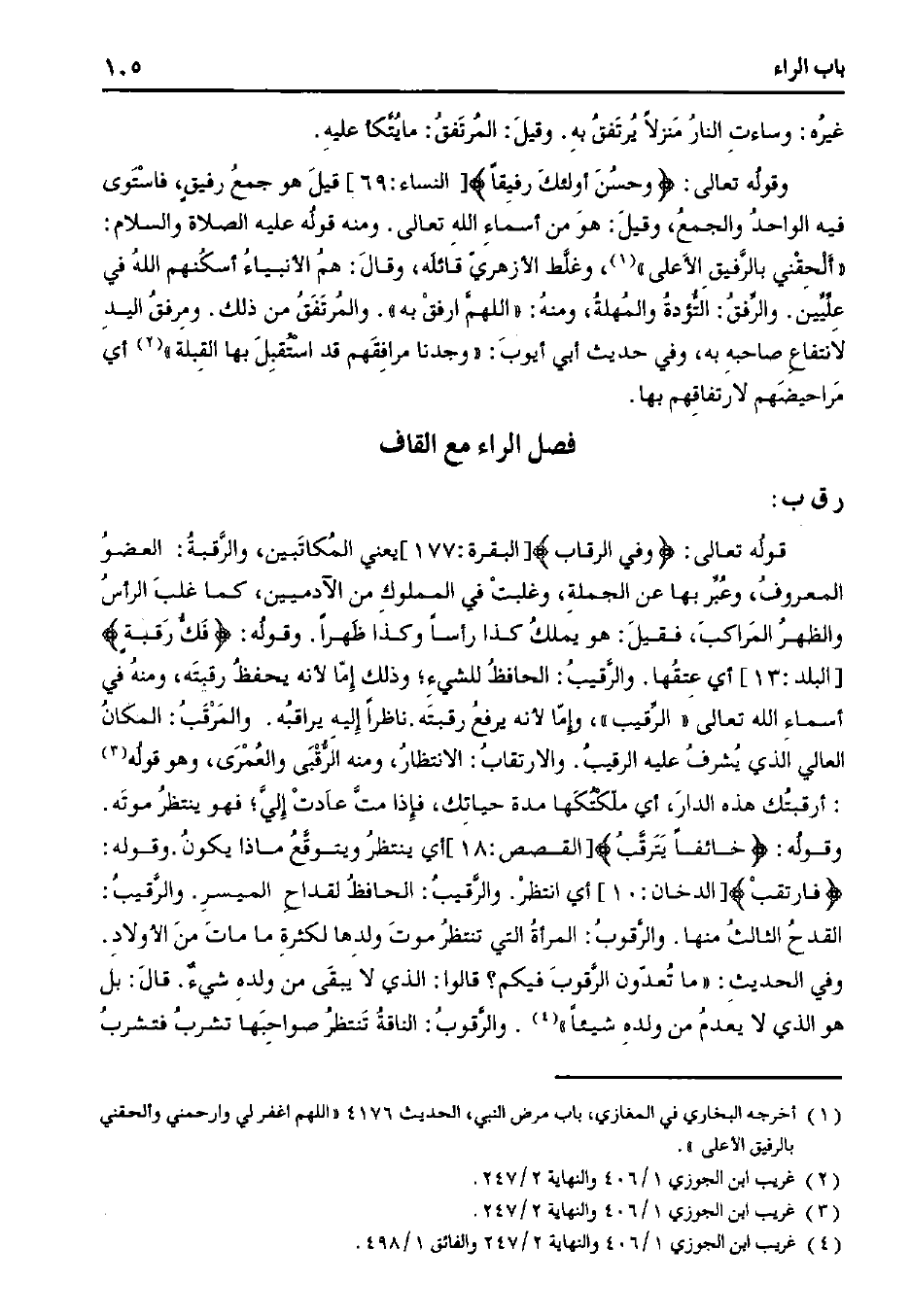 قوله تعالى:} وفي الرقاب {[البقرة: 177] يعني المكاتبين، والرقبة: العضو المعروف، وعبر بها عن الجملة، وغلبت في المملوك من الآدميين، كما غلب الرأس والظهر المراكب، فقيل: هو يملك كذا رأسًا وكذا ظهرًا. وقوله:} فك رقبةٍ {[البلد: 13] أي عنقها. والرقيب: الحافظ للشيء؛ وذلك إما لأنه يحفظ رقبته، ومنه في أسماء الله تعالى "الرقيب"، وإما لأنه يرفع رقبته. ناظرًا إليه يراقبه. والمرقب: المكان العالي الذي يشرف عليه الرقيب. والارتقاب: الانتظار، ومنه الرقبي والعمري، وهو قوله: أرقبتك هذه الدار، أي ملكتكها مدة حياتك، فإذا مت عادت إلي؛ فهو ينتظر موته. وقوله:} خائفًا يترقب {[القصص: 18] أي ينتظر ويتوقع ماذا يكون. وقوله:} فارتقب {[الدخان: 10] أي انتظر. والرقيب: الحافظ لقداح الميسر. والرقيب: القدح الثالث منها. والرقوب: المرأة التي تنتظر موت ولدها لكثرة ما مات من الأولاد. وفي الحديث: "ما تعدون الرقوب فيكم؟ قالوا: الذي لا يبقى من ولده شيء. قال: بل هو الذي لا يعدم من ولده شيئًا". والرقوب: الناقة تنتظر صواحبها تشرب فتشرب