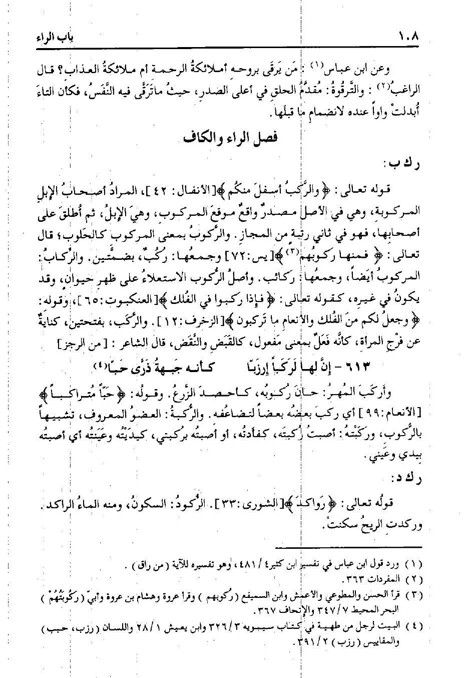 قوله تعالى:} والركب أسفل منكم {[الأنفال: 42]، المراد أصحاب الإبل المركوبة، وهي في الأصل مصدر واقع موقع المركوب، وهي الإبل، ثم أطلق على أصحابها، فهو في ثاني رتبةٍ من المجاز. والركوب بمعنى المركوب كالحلوب؛ قال تعالى:} فمنها ركوبهم {[يس: 72] وجمعها: ركب، بضمتين. والركاب: المركوب أيضًا، وجمعها: ركائب. وأصل الركوب الاستعلاء على ظهر حيوان، وقد يكون في غيره، كقوله تعالى:} فإذا ركبوا في الفلك {[العنكبوت: 65]، وقوله:} وجعل لكم من الفلك والأنعام ما تركبون {[الزخرف: 12]. والركب، بفتحتين، كناية عن فرج المرأة، كأنه فعل بمعنى مفعول، كالقبض والنقض، قال الشاعر: [من الرجز]