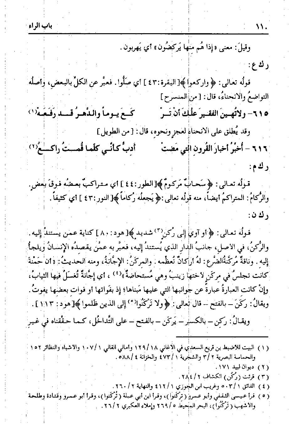 قوله تعالى:} أو آوي إلى ركنٍ شديدٍ {[هود: 80] كناية عمن يستند إليه. والركن، في الأصل، جانب الدار الذي يستند إليه، فعبر به عمن يقصده الإنسان ويلجأ إليه. وناقة مركنة الضرع: له أركان تعظمه. والمركن: الإجانة، ومنه الحديث: "أن حمنة كانت تجلس في مركن لأختها زينب وهي مستحاضة"، أي إجانة تغسل فيها الثياب، وإن كانت العبارة عبارًة عن جوانبها التي عليها مبناها؛ إذ بفواتها أو فوات بعضها يفوت. ويقال: ركن - بالفتح - قال تعالى:} ولا تركنوا إلى الذين ظلموا {[هود: 113].