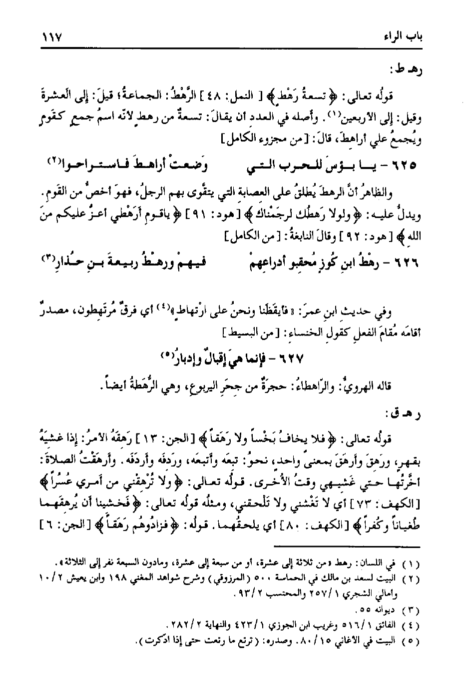 قوله تعالى: {تسعة رهطٍ} [النمل: 48] الرهط: الجماعة؛ قيل: إلى العشرة وقيل: إلى الأربعين. واصله في العدد أن يقال: تسعة من رهطٍ لأنه اسم جمعٍ كقومٍ ويجمع على أراهط، قال: [من مجزوء الكامل]