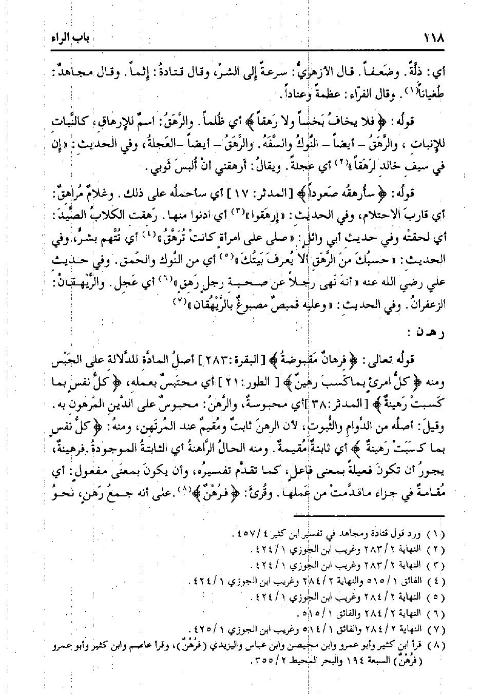 قوله تعالى:} فرهان مقبوضة {[البقرة: 283] أصل المادة للدلالة على الحبس ومنه} كل امرئٍ بما كسب رهين {[الطور: 21] أي محتبس بعمله،} كل نفسٍ بما كسبت رهينة {[المدثر: 38] أي محبوسة، والرهن: محبوس على الدين المرهون به. وقيل: أصله من الدوام والثبوت، لأن الرهن ثابت ومقيم عند المرتهن، ومنه:} كل نفسٍ بما كسبت رهينة {أي ثابتة مقيمة. ومنه الحال الراهنة أي الثابتة الموجودة. فرهينة، يجوز أن تكون فعيلًة بمعنى فاعلٍ، كما تقدم تفسيره، وأن يكون بمعنى مفعولٍ: أي مقامة في جزاء ما قدمت من ععملها. وقرئ:} فرهن {. على أنه جمع رهنٍ، نحو