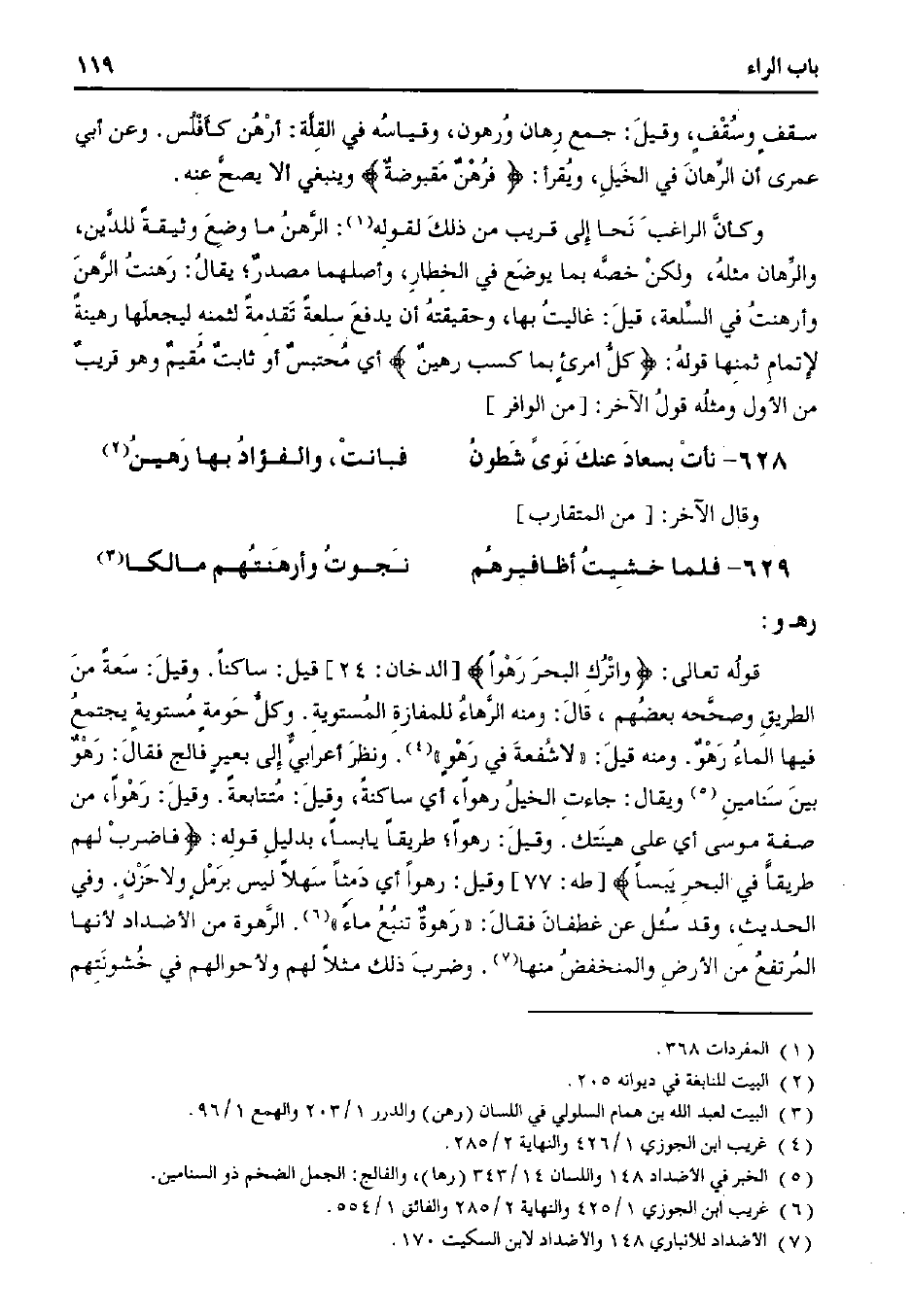 وكأن الراغب نحا إلى قريب من ذلك لقوله: الرهن ما وضع وثيقًة للدين، والرهان مثله، ولكن خصه بما يوضع في الخطار، وأصلهما مصدر؛ يقال: رهنت الرهن وأرهنت في السلعة، قيل: غاليت بها، وحقيقته أن يدفع سلعًة تقدمًة لثمنه ليجعلها رهينًة لإتمام ثمنها قوله:} كل امرئٍ بما كسب رهين {أي محتبس أو ثابت مقيم وهو قريب من الأول ومثله قول الآخر: [من الوافر]