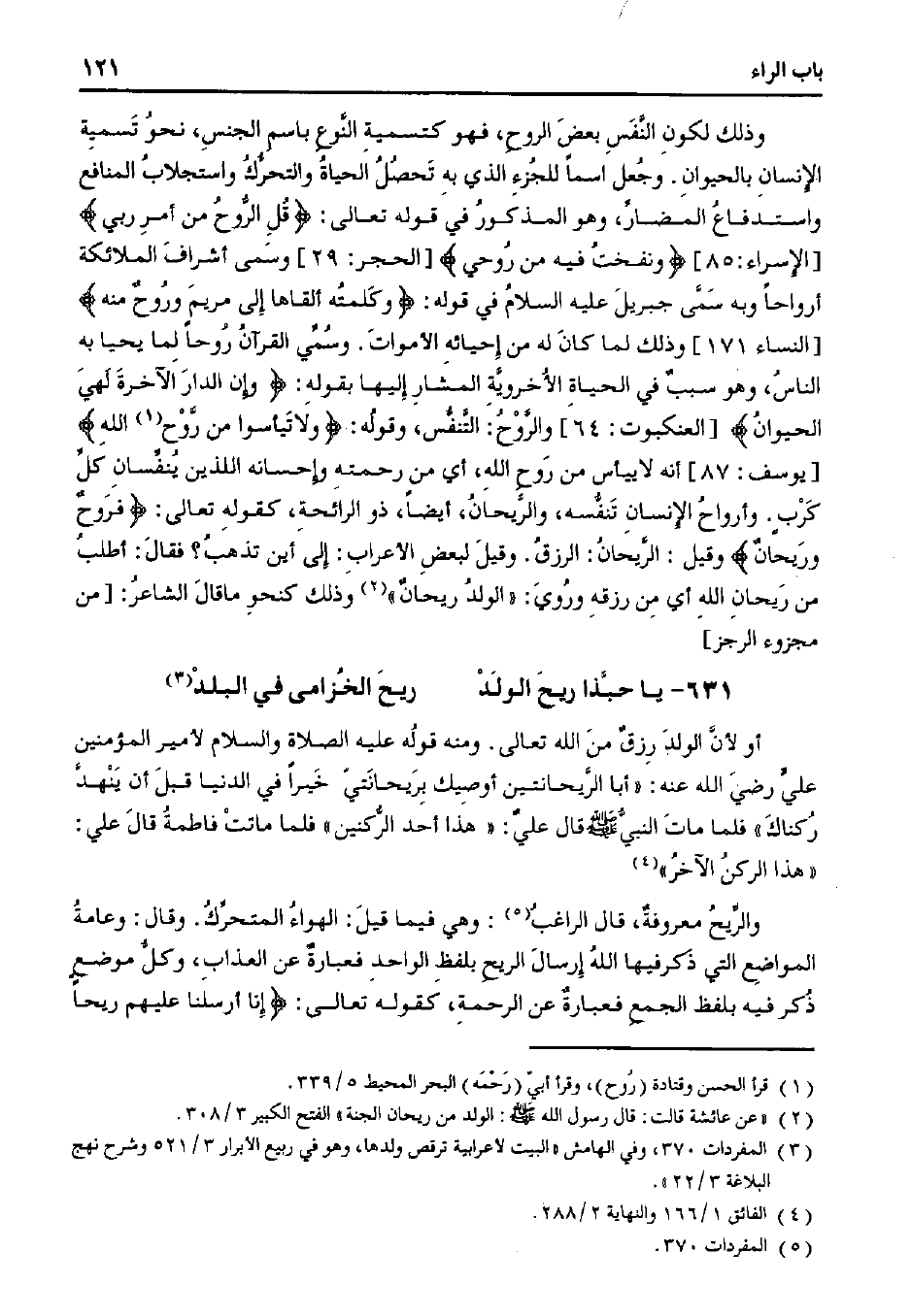 وذلك لكون النفس بعض الروح، فهو كتسمية النوع باسم الجنس، نحو تسمية الإنسان بالحيوان. وجعل اسمًا للجزء الذي به تحصل الحياة والتحرك واستجلاب المنافع واستدفاع المضار، وهو المذكور في قوله تعالى:} قل الروح من أمر ربي {[الإسراء: 85]} ونفخت فيه من روحي {[الحجر: 29] وسمى أشراف الملائكة أرواحًا وبه سمي جبريل عليه السلام في قوله:} وكلمته ألقاها إلى مريمٍ وروح منه {[النساء: 171] وذلك لما كان له من إحيائه الأموات. وسمي القرآن روحًا لما يحيا به الناس، وهو سبب في الحياة الأخروية المشار إليها بقوله:} وإن الدار الآخرة لهي الحيوان {[العنكبوت: 64] والروح: التنفس، وقوله:} ولا تيأسوا من روح الله {[يوسف: 87] أنه لا ييأس من روح الله، أي من رحمته وإحسانه اللذين ينفسان كل كرب. وأرواح الإنسان تنفسه، والريحان، أيضًا، ذو الرائحة، كقوله تعالى:} فروح وريحان {وقيل: الريحان: الرزق. وقيل لبعض الأعراب: إلى أين تذهب؟ فقال: أطلب من ريحان الله أي من رزقه وروي: "الولد ريحان" وذلك كنحو ما قال الشاعر: [من مجزوء الرجز]