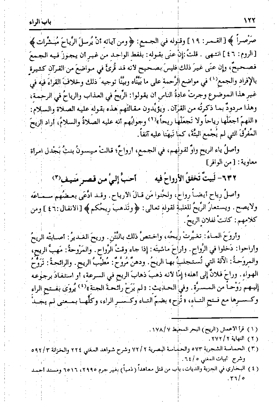 وأصل ياء الريح واو لقولهم، في الجمع، أرواح؛ قالت ميسون بنت بجدل امرأة معاوية: [من الوافر]