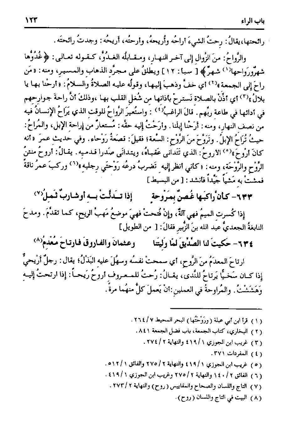 والرواح: من الزوال إلى آخر النهار، ومقابله الغدو، كقوله تعالى:} غدوها شهرواواحها شهر {[سبأ: 12] ويطلق على مجرد الذهاب والمسير، ومنه: "من راح إلى الجمعة" أي خف وذهب إليها، وقوله عليه الصلاة والسلام: "أرحنا بها يا بلال" أي أذن بالصلاة نسترح بأذانها من شغل القلب بها، وذلك أن راحة جوارحهم في أدائها في طاعة ربهم. قال الراغب: واستعير الرواح للوقت الذي يراح الإنسان فيه من نصف النهار، ومنه: أرحنا إبلنا. وأرحت إليه حقه: مستعاًر من إراحة الإبل، والمراح: حيث تراح الإبل. وتروح من الروح: السعة؛ فقيل: قصعة روحاء. وفي حديث عمر "أنه كان أروح" الأروح: الذي تتداني عقباه، ويتداني صدرا قدميه. يقال: أروح منتن الروح والروحة، ومنه: "كأني أنظر إليه تضرب درعه روحتي رجليه" وركب عمر ناقًة فمشت به مشيًا جيدًا فأنشد: [من البسيط]