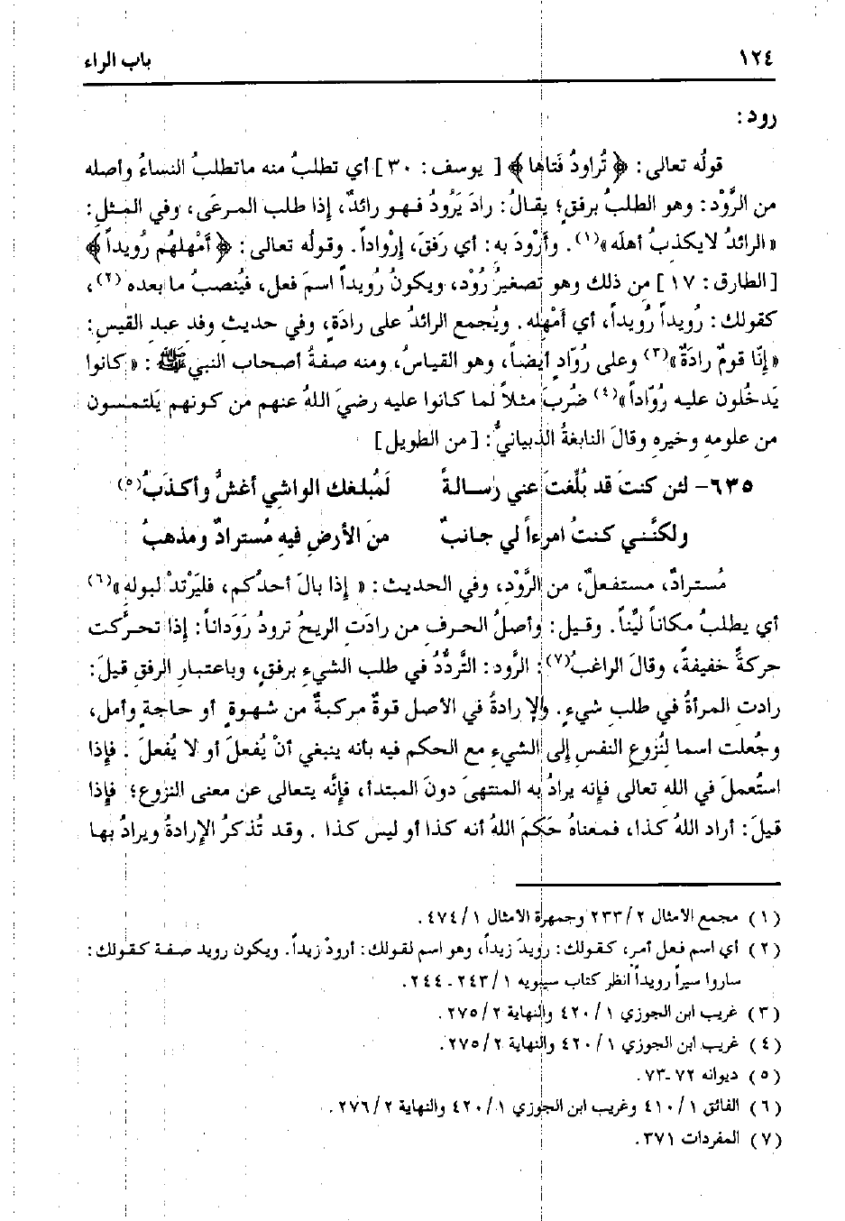 قوله تعالى:} تراود فتاها {[يوسف: 30] أي تطلب منه ما تطلب النساء وأصله من الرود: وهو الطلب برفقٍ؛ يقال: راد يرود فهو رائد، إذا طلب المرعى، وفي المثل: "الرائد لا يكذب أهله". وأرود به: أي رفق، إروادًا. وقوله تعالى:} أمهلهم رويدًا {[الطارق: 17] من ذلك وهو تصغير رود، ويكون رويدًا اسم فعل، فينصب ما بعده، كقولك: رويدًا رويدًا، أي أمهله. ويجمع الرائد على رادةٍ، وفي حديث وفد عبد القيس: "إنا قوم رادة" وعلى روادٍ أيضًا، وهو القياس، ومنه صفة أصحاب النبي صلى الله عليه وسلم: "كانوا يدخلون عليه روادًا" صرب مثلاً لما كانوا عليه رضي الله عنهم من كونهم يلتمسون من علومه وخيره وقال النابغة الذبياني: [من الطويل]
